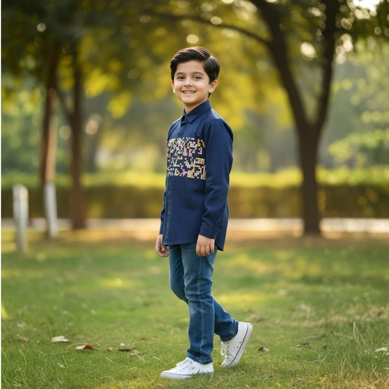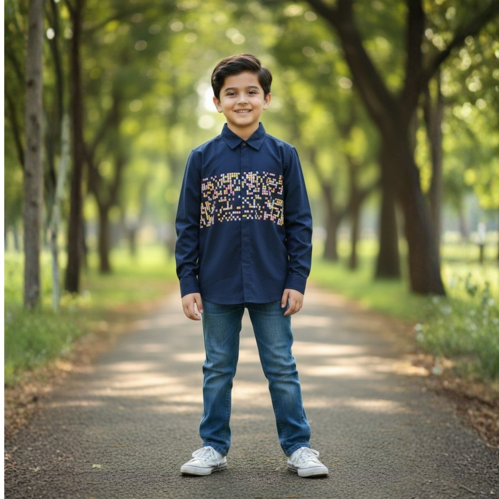 Navy shirt with a vibrant pixel-style front print. A cool and trendy pick for a sharp casual look. Designed with a classic collar for a playful yet smart look.