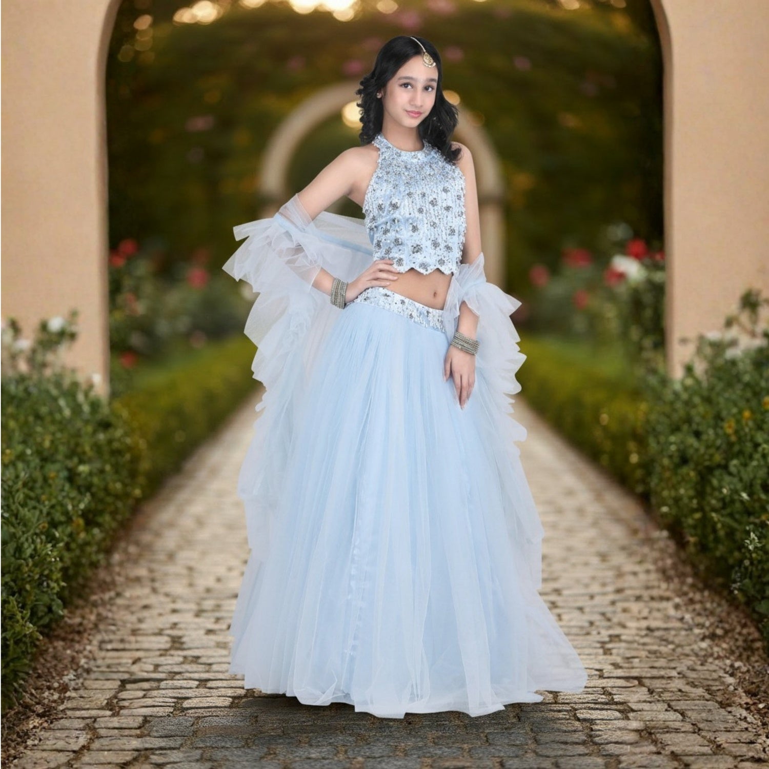 Graceful and timeless, this lehenga is crafted in soft net fabric for a dreamy, flowing silhouette. Paired with a luxurious Dutch satin blouse, it is adorned with delicate pearl work that adds a touch of elegance and sparkle. Perfect for weddings, festive celebrations, and special occasions, this ensemble blends classic charm with refined detailing—making your little one shine with poise and beauty.