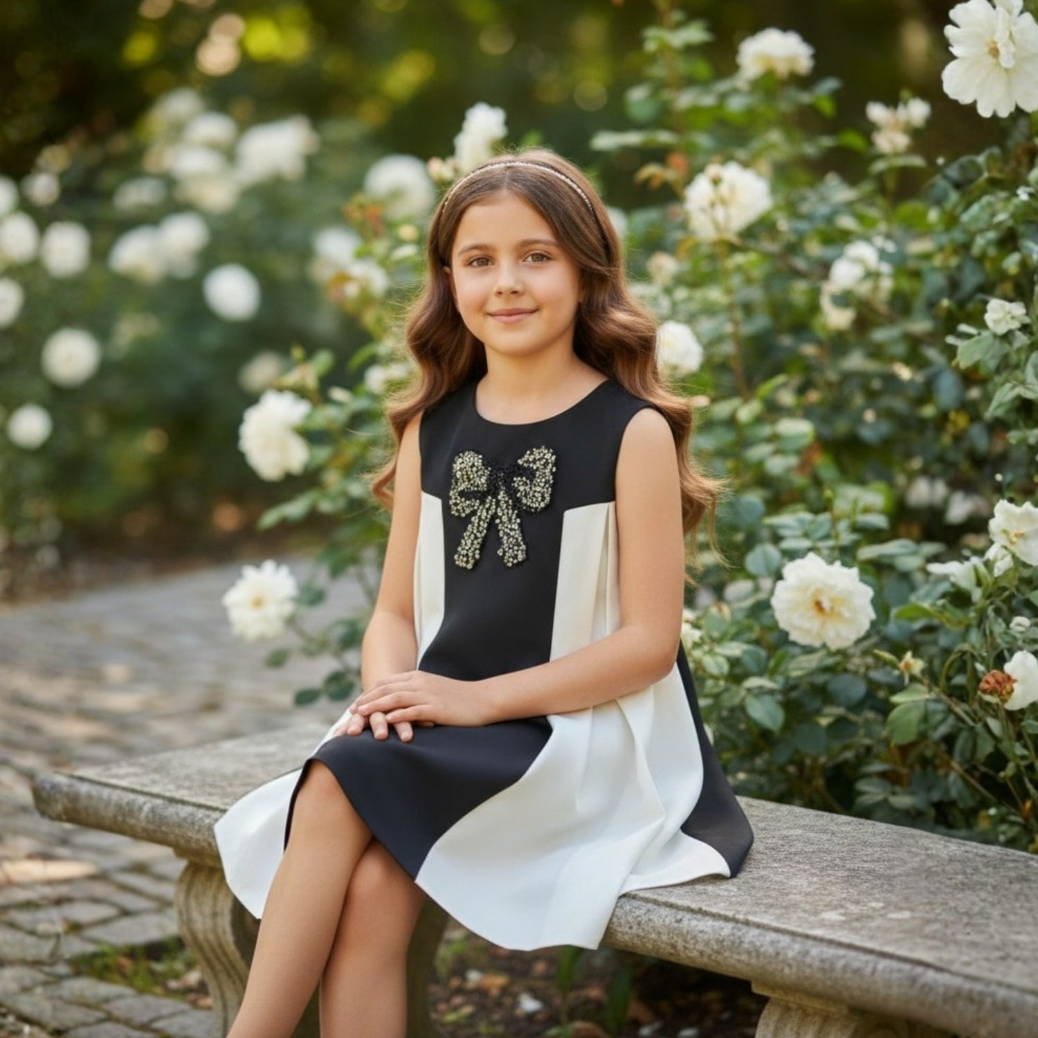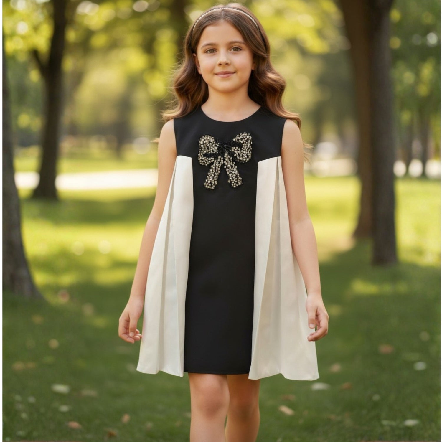 A stylish black-and-white sleeveless dress featuring a satin bodice with a pearl-embellished bow and structured white pleated panels.