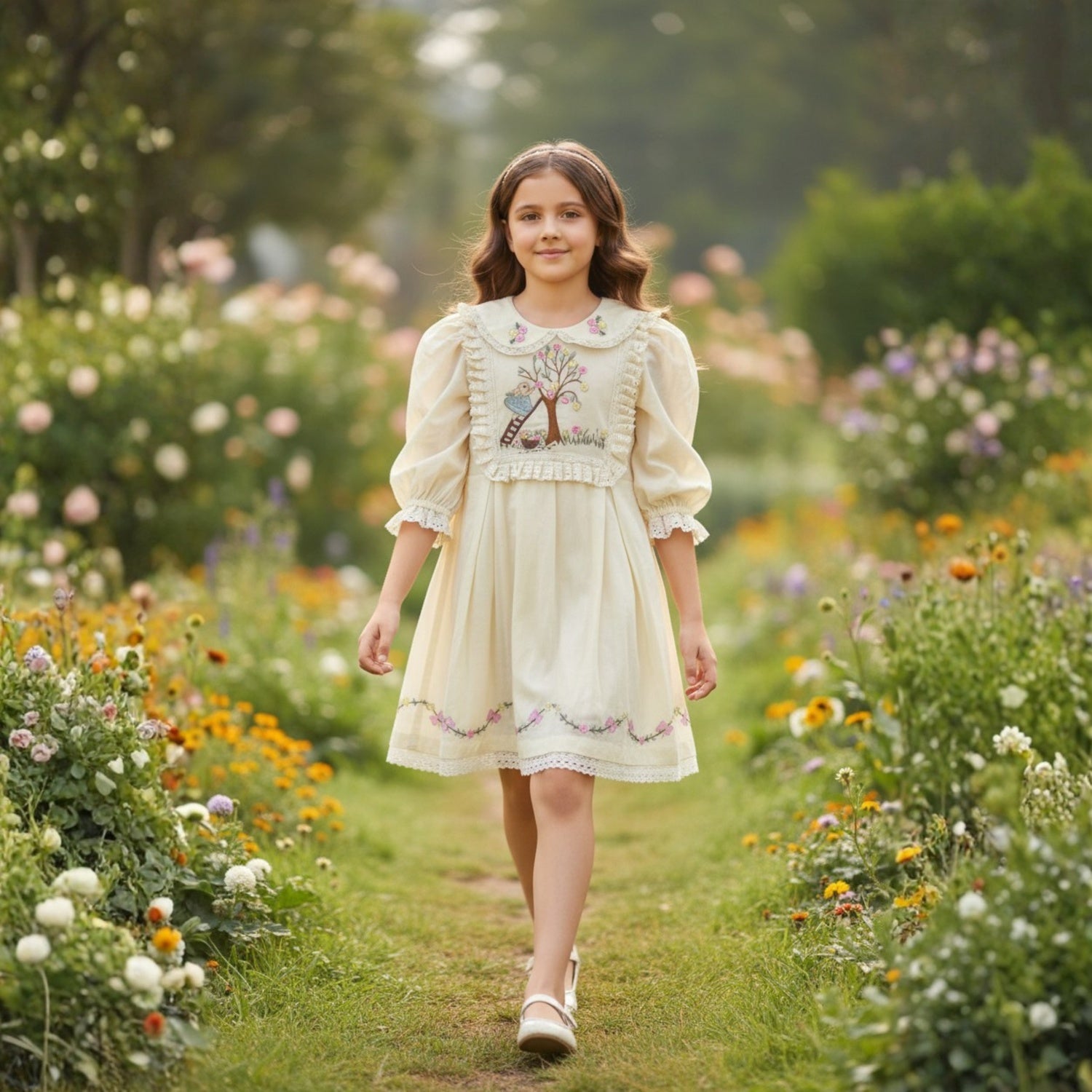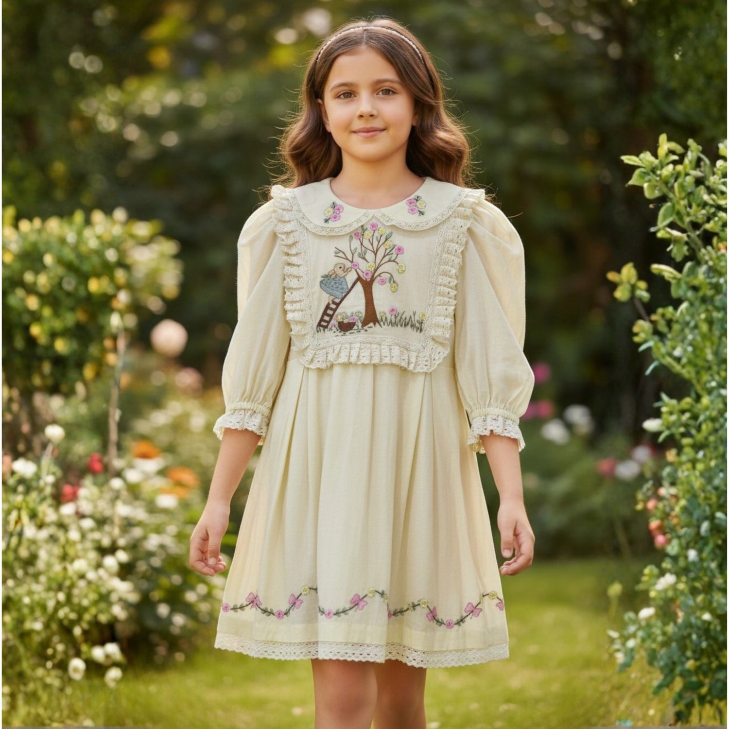 A soft lemon long-sleeve dress featuring a lace-trimmed collar and bodice with delicate floral and tree embroidery. Finished with ruffle details and a scalloped lace hem for a graceful, vintage-inspired look.