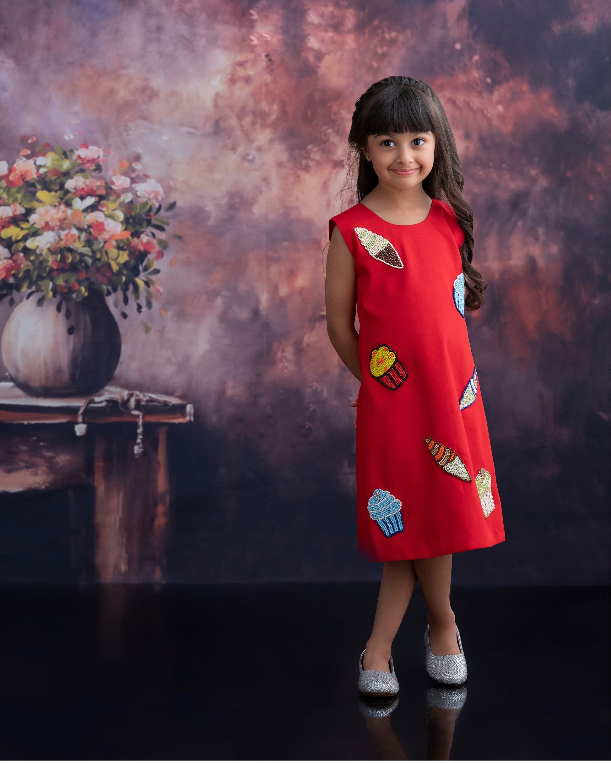 This playful straight-fit kids’ dress is adorned with embroidered ice cream motifs, enhanced with intricate beads and crystal work, creating a fun yet elegant look. Perfect for birthdays, parties, and festive occasions. Key Features: • Straight-fit design for effortless style • Ice cream motif patches with detailed embroidery • Bead and crystal embellishments for sparkle • Lightweight and comfortable for kids • Ideal for birthdays, parties & festive celebrations. .