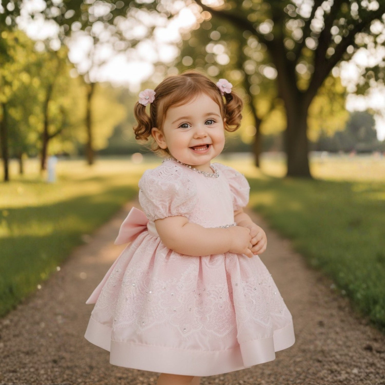 Blush pink luxury party dress featuring a lace overlay bodice, pearl-embellished neckline and waist, statement puff sleeves, and a voluminous lace skirt with delicate pearl accents.