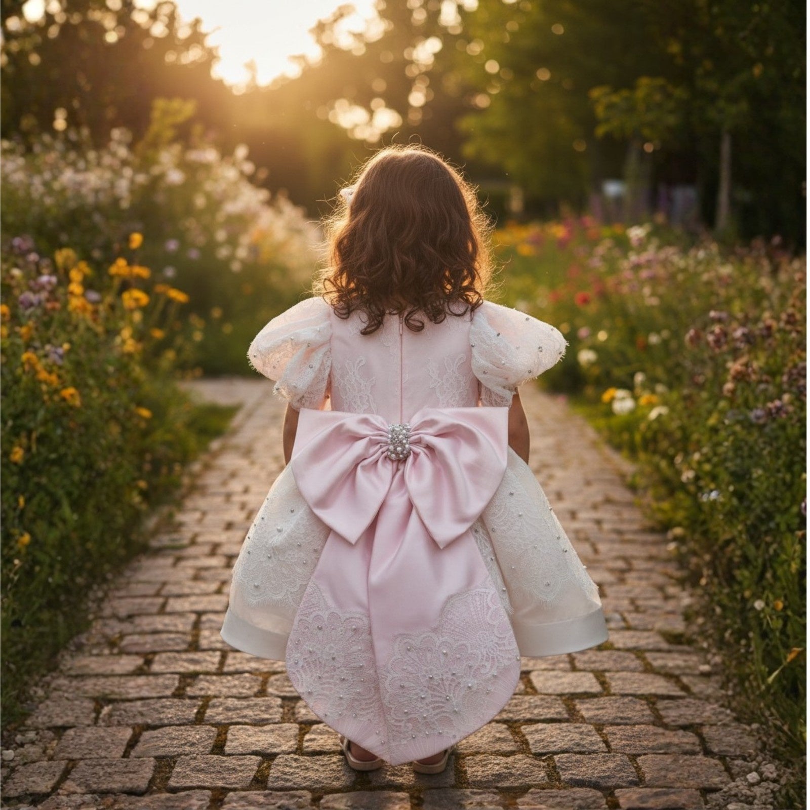 Crafted in delicate organza, this elegant dress features a soft lace overlay enhanced with subtle pearl embellishments. Designed to capture a timeless charm, it is perfect for birthdays, weddings, and special celebrations, offering a graceful and refined look for your little girl.