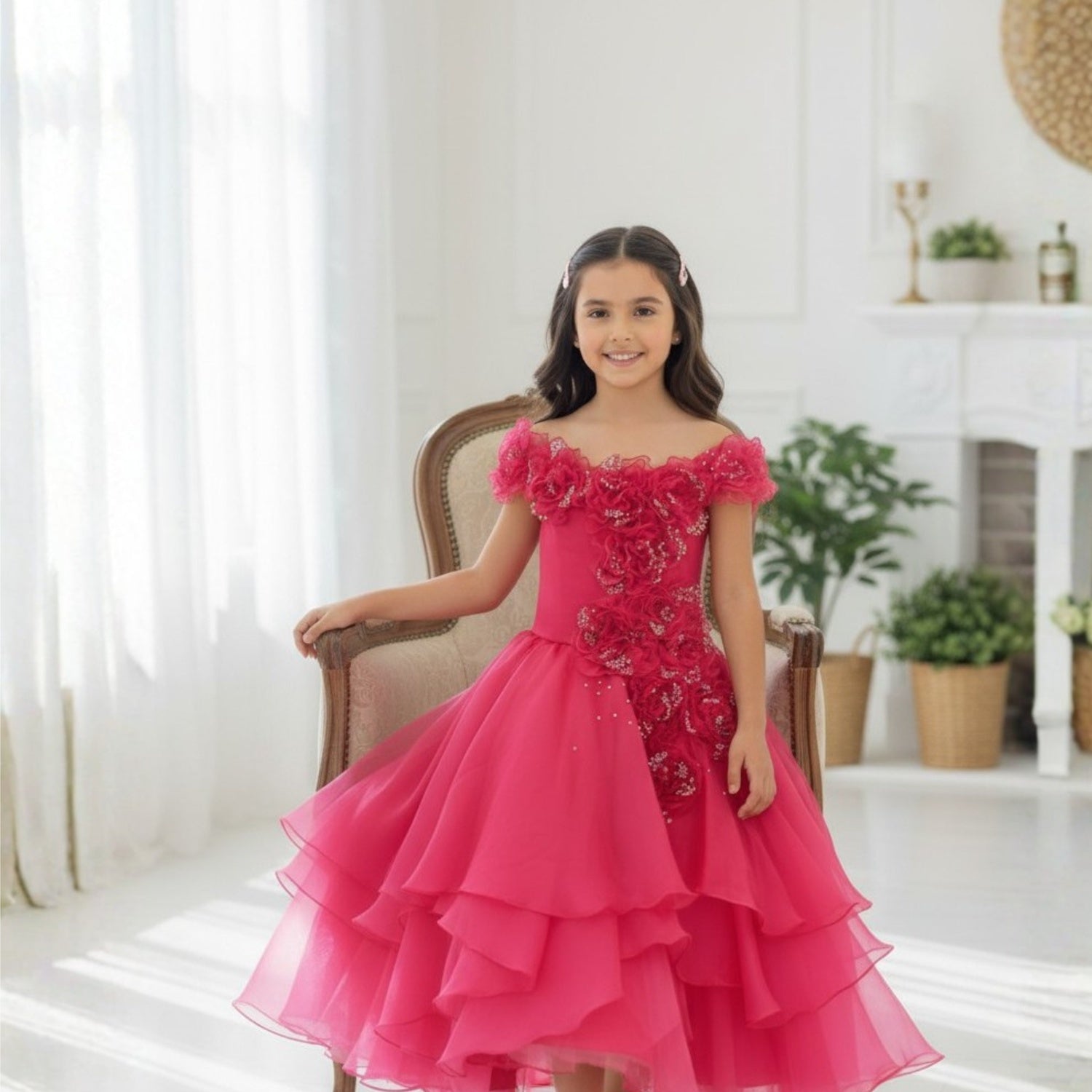 A stunning red off-shoulder gown adorned with dramatic 3D floral appliqus and sparkling bead embellishments. Featuring a fitted bodice and layered organza skirt, this statement dress is perfect for grand celebrations and special occasions.