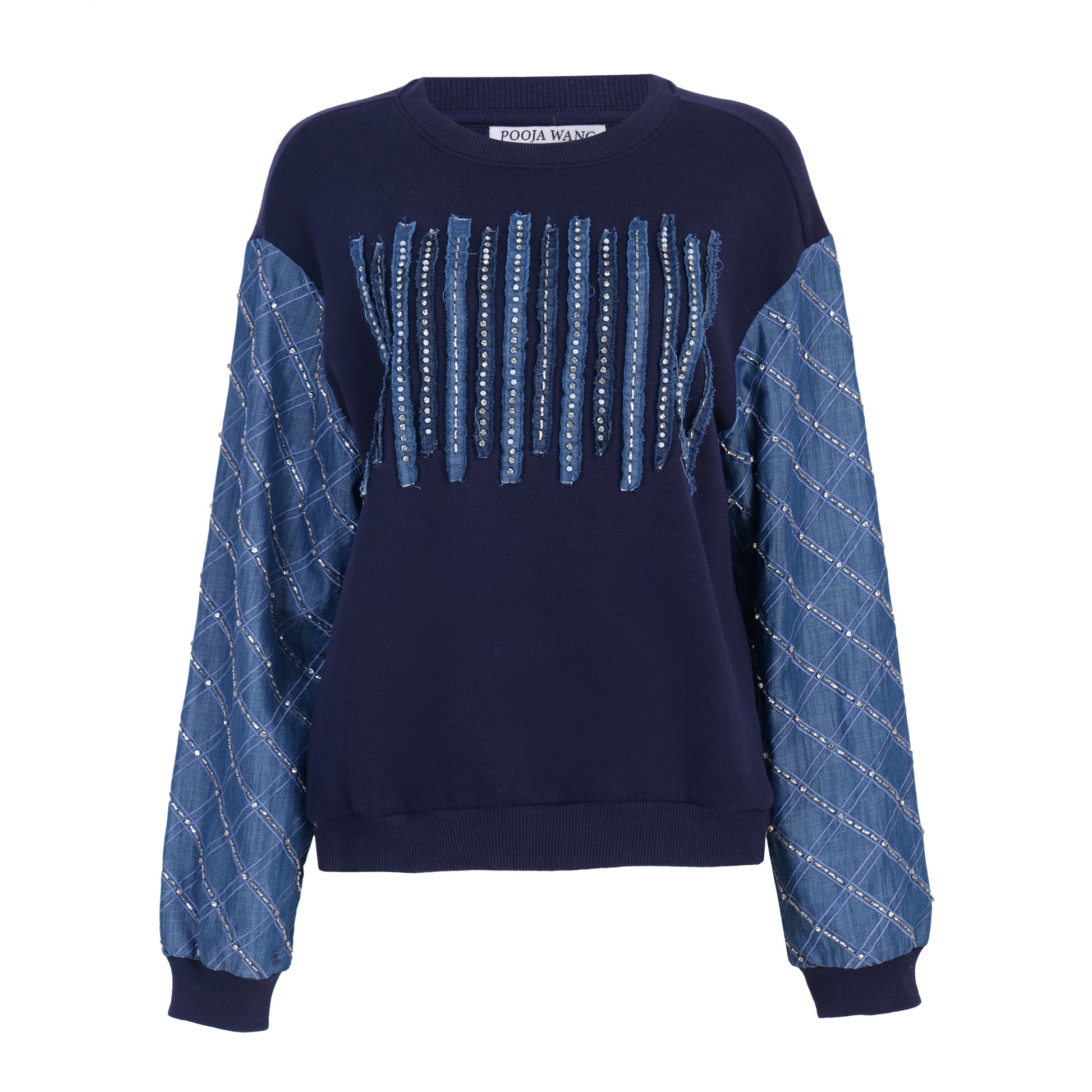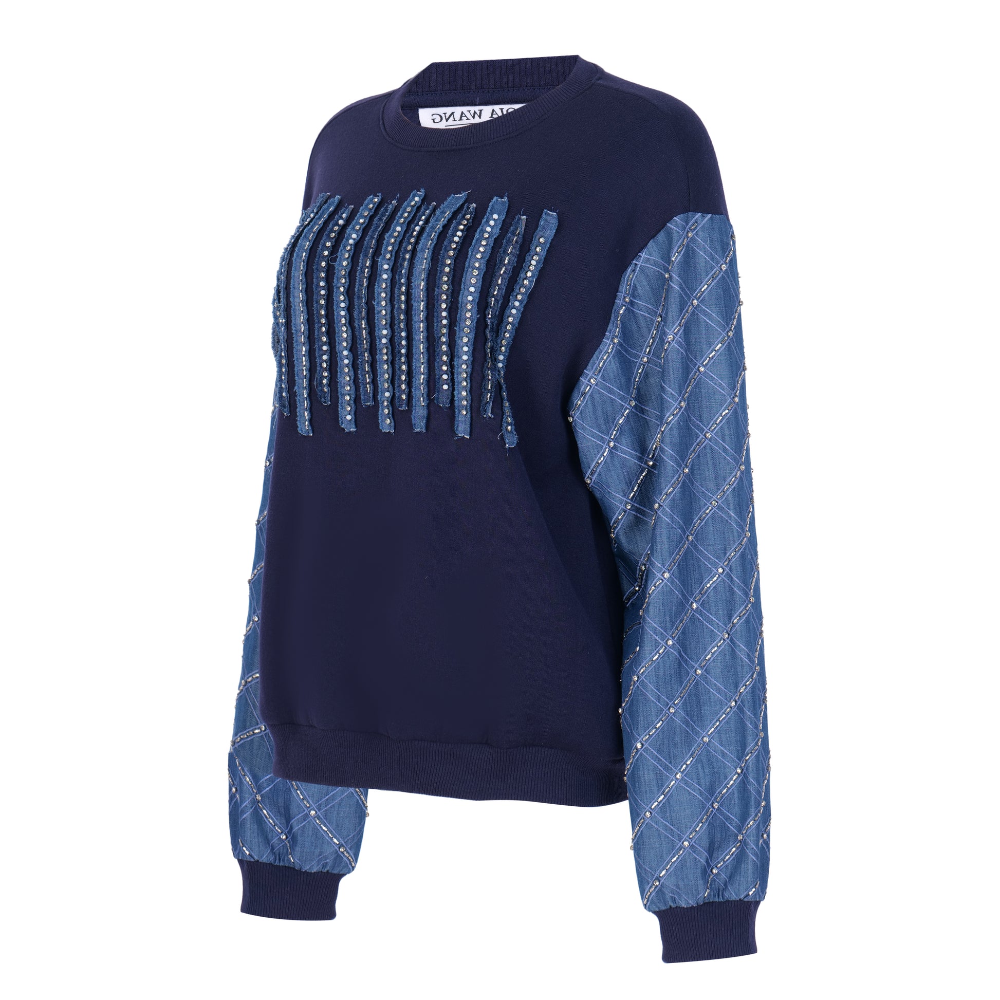 Elevate casual fashion with our Blue Sweatshirt with Denim Sleeves & Crystal Work, a unique blend of comfort and sparkle. Designed for trendsetters, this sweatshirt combines soft fabric with rugged denim and shimmering crystal embellishments for a chic, standout look. Key Features: 1. Stylish Blue Sweatshirt – A versatile and trendy wardrobe essential. 2. Denim Sleeves for a Unique Touch – Adds a cool, edgy contrast to the design. 3. Sparkling Crystal Embellishments – A subtle shimmer for a glamorous effect. 4. Soft & Comfortable Fabric – Ensures all-day coziness and ease of movement. 5. Perfect for Casual & Trendy Looks – Ideal for outings, playdates, and stylish layering.