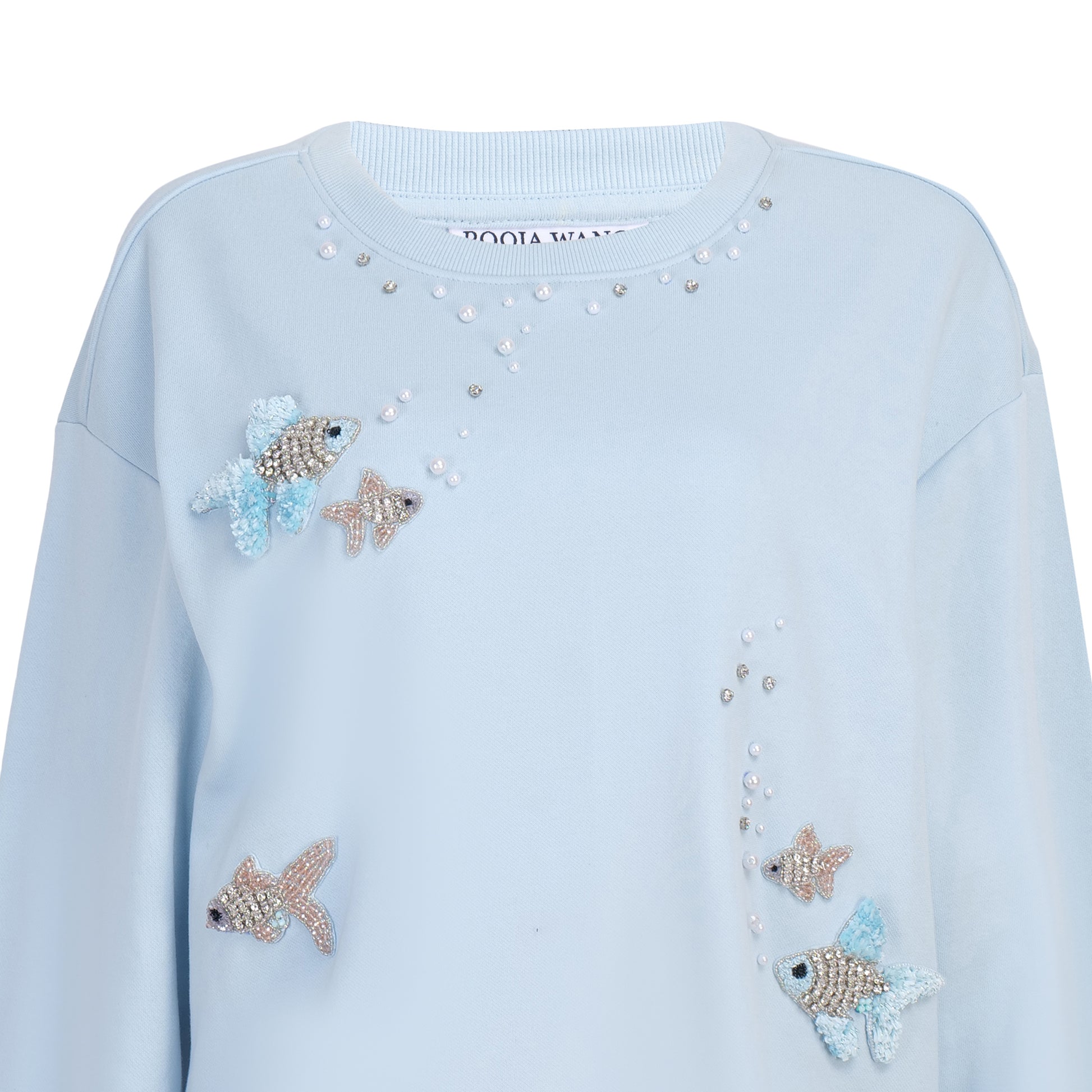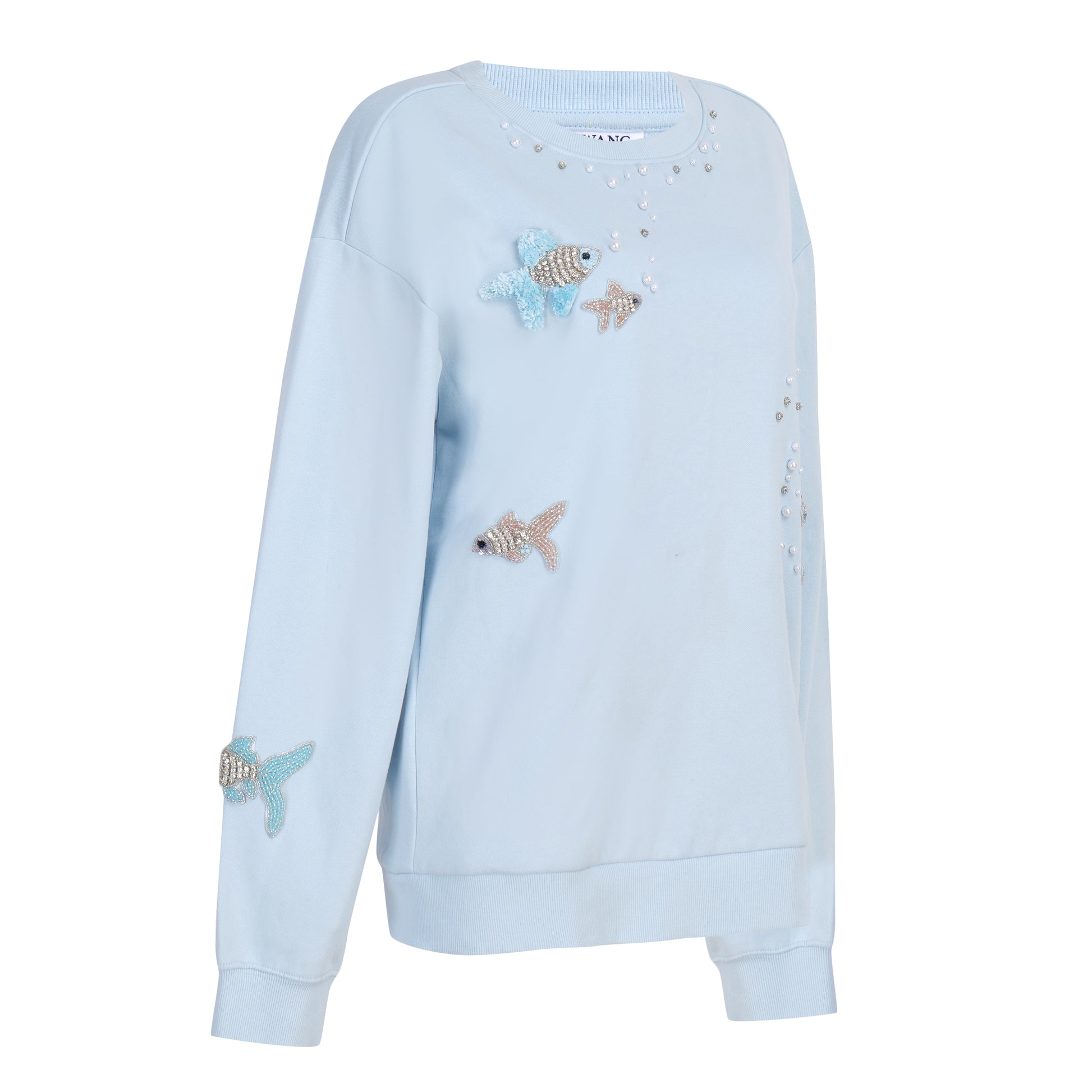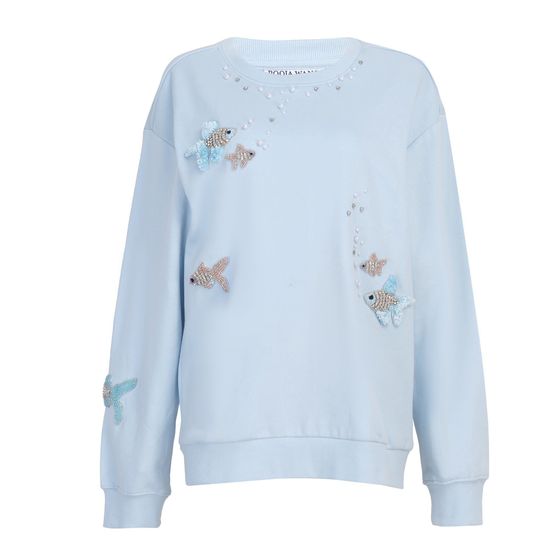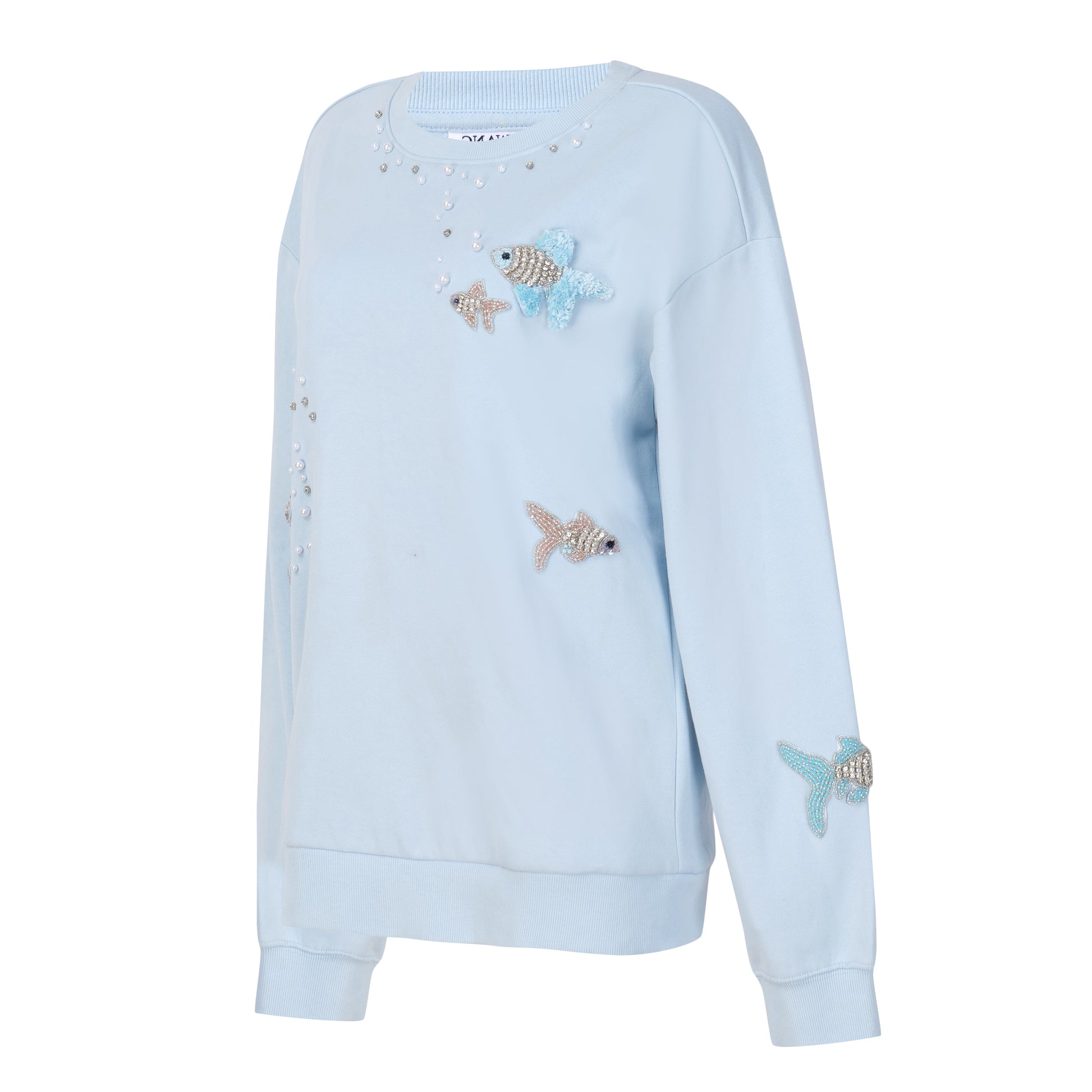 Dive into effortless style with our Ice Blue Sweatshirt with Crystal & Beaded Fish, a perfect blend of comfort and sophistication. Adorned with intricate beadwork and shimmering crystals, this sweatshirt brings a refreshing touch of ocean-inspired elegance to your wardrobe. Key Features: 1. Exquisite Crystal & Beaded Fish Embellishment – Adds a unique, artistic flair. 2. Soft Ice Blue Hue – A calming and elegant shade for a chic look. 3. Subtle Sparkle & Detailing – Perfect for those who love a hint of glam. 4. Comfortable & Breathable Fabric – Ensures all-day ease and warmth. 5. Versatile Styling – Ideal for casual wear, travel, or layering with statement pieces.