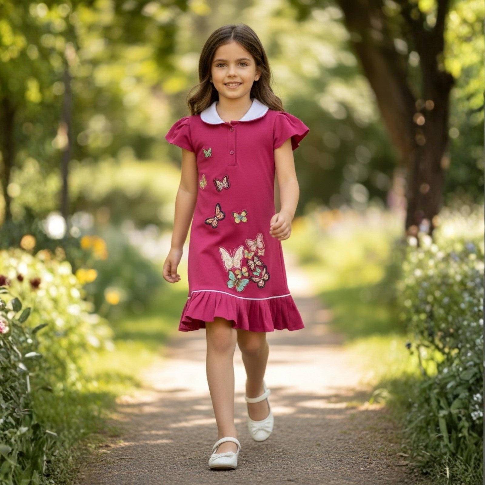 Bright pink cotton dress featuring a contrast white-trimmed collar and puff sleeves. Beautifully decorated with colorful butterfly appliqu? and finished with a soft pleated hem, giving it a charming and playful look.