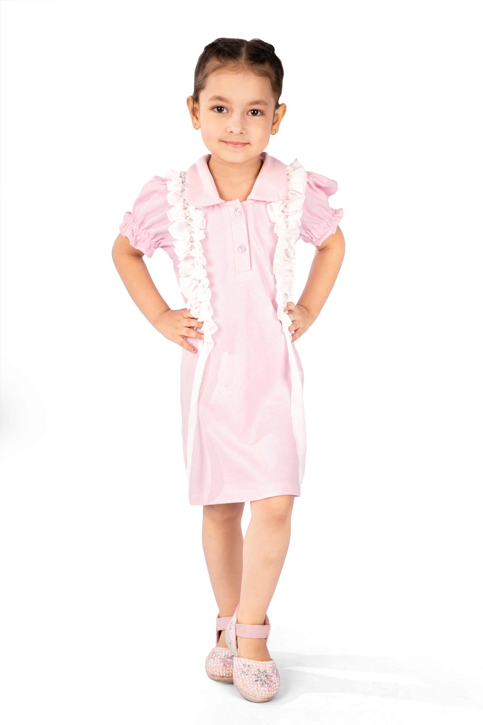 Soft baby pink meets playful elegance in this polo-style dress, accented with crisp white frills along the neckline and hem. With a structured collar, subtle button placket, and a gentle A-line cut, it balances sporty charm and feminine detail effortlessly. Perfect for casual garden parties, brunch dates, or everyday wear.