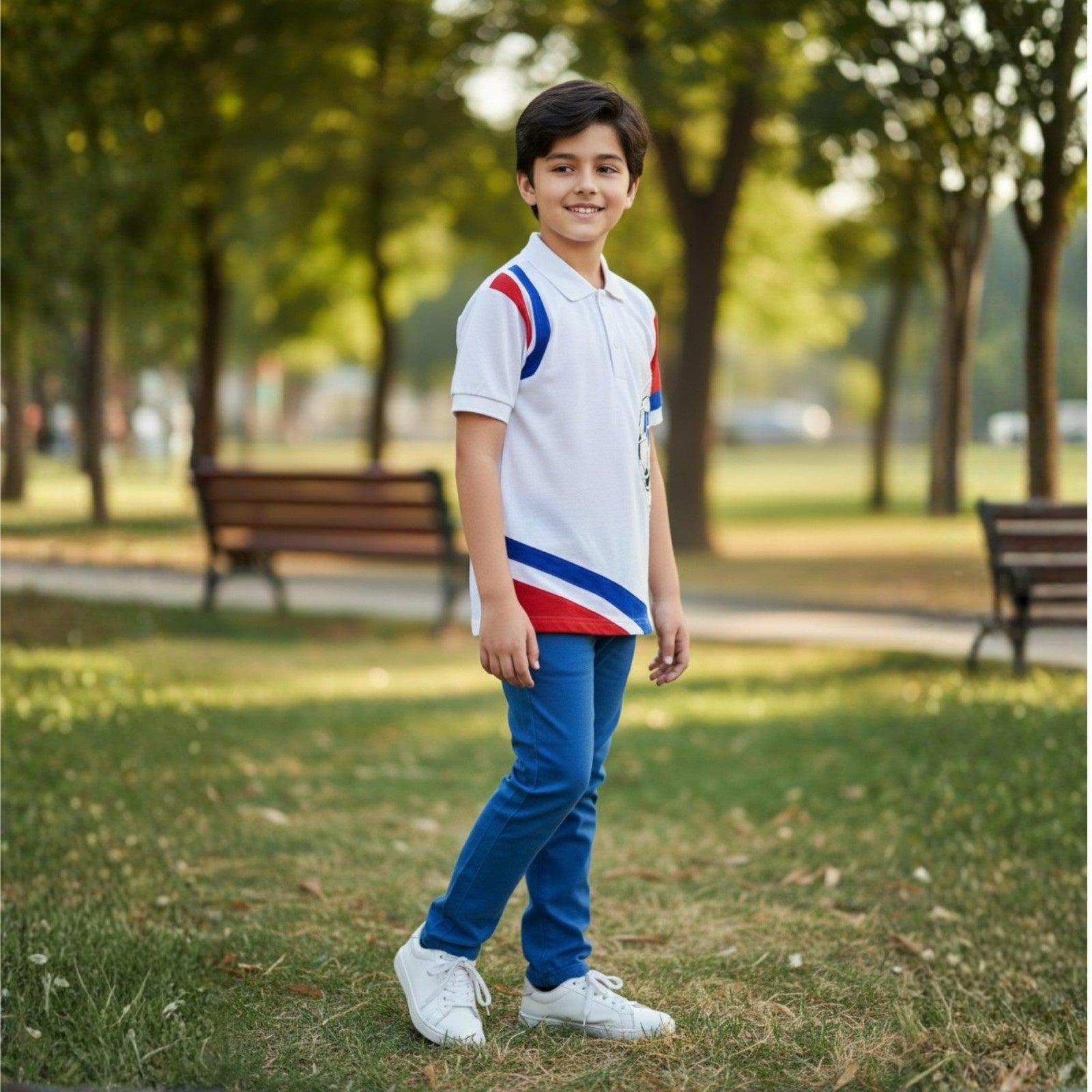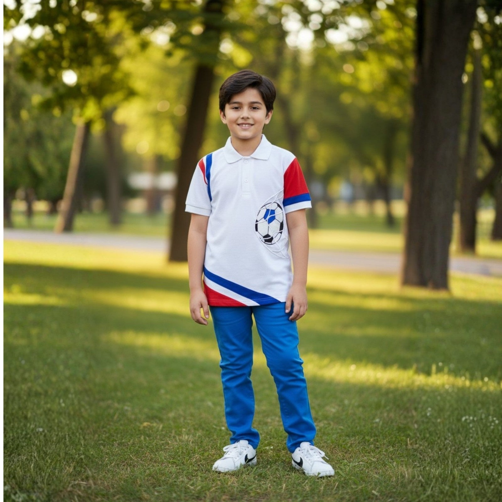 A sporty white polo featuring bold red and blue Color-block accents and a striking football graphic detail on the front. Designed with a classic collar and button placket, this stylish piece adds fun.