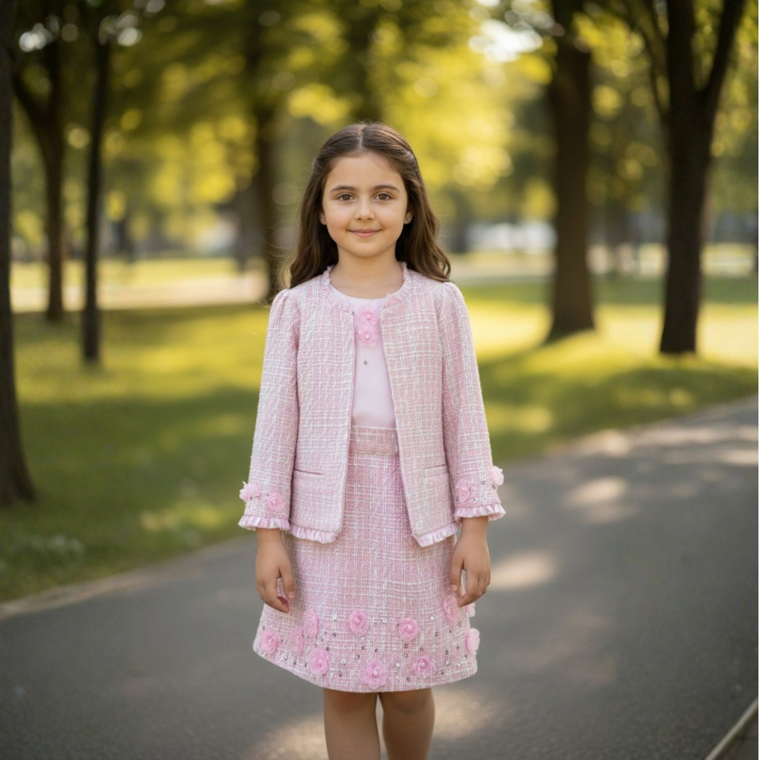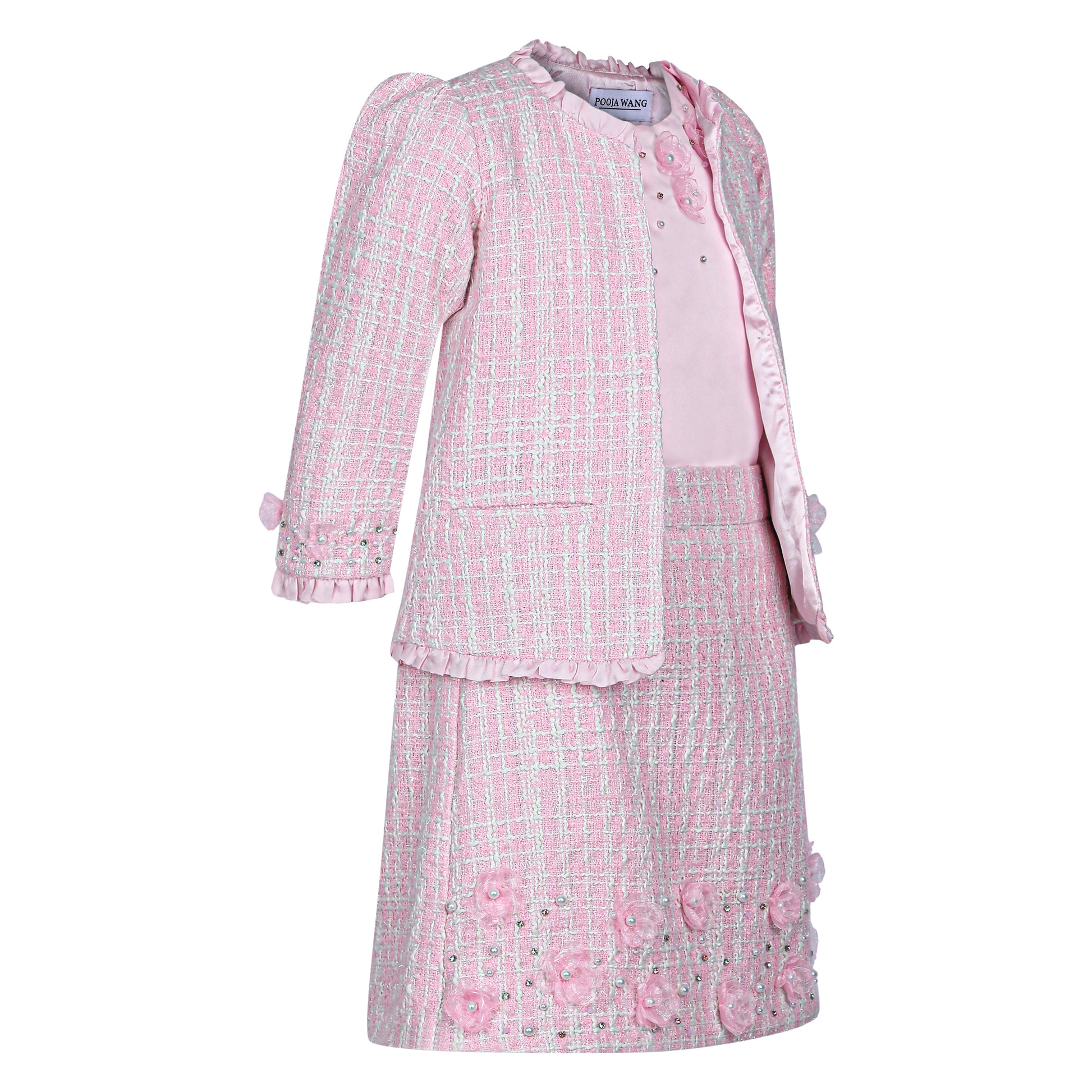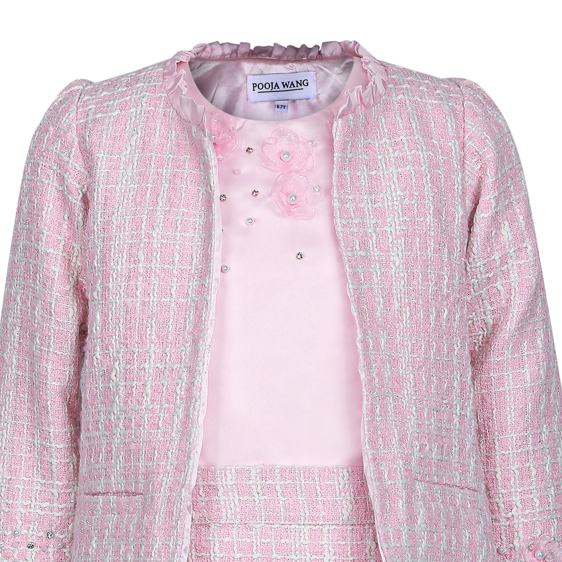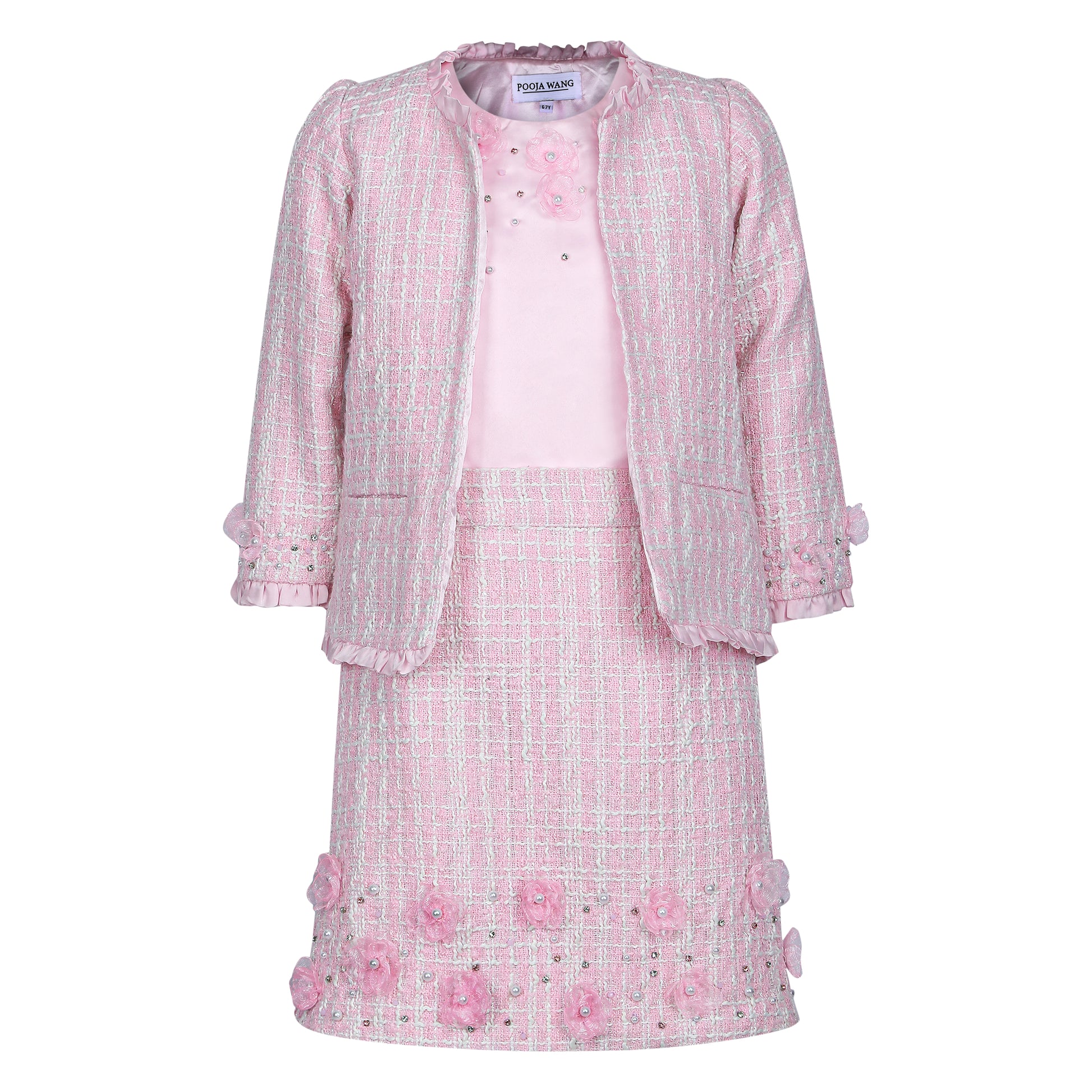 Chic, versatile, and full of charm — this Pink Tweed Set is a timeless addition to any wardrobe. Designed as a three-piece ensemble, it includes a stylish top, a classic jacket, and a matching skirt, all crafted in soft tweed fabric for a sophisticated look. Subtle adda work detailing adds a hint of sparkle and artisanal finesse, making the set perfect for both festive gatherings and special occasions. Worn together for a coordinated statement or styled separately, this set offers endless possibilities with elegance at its core.