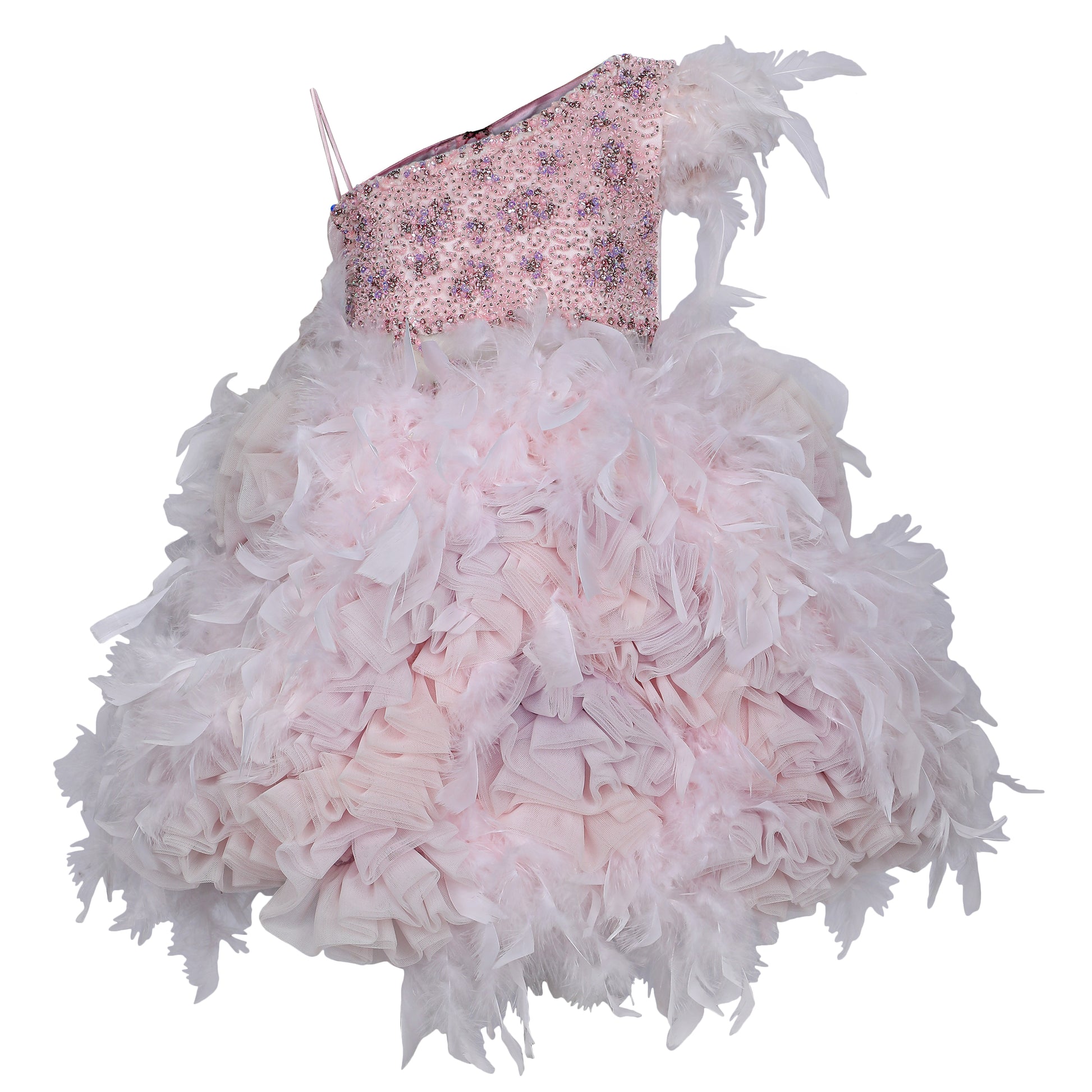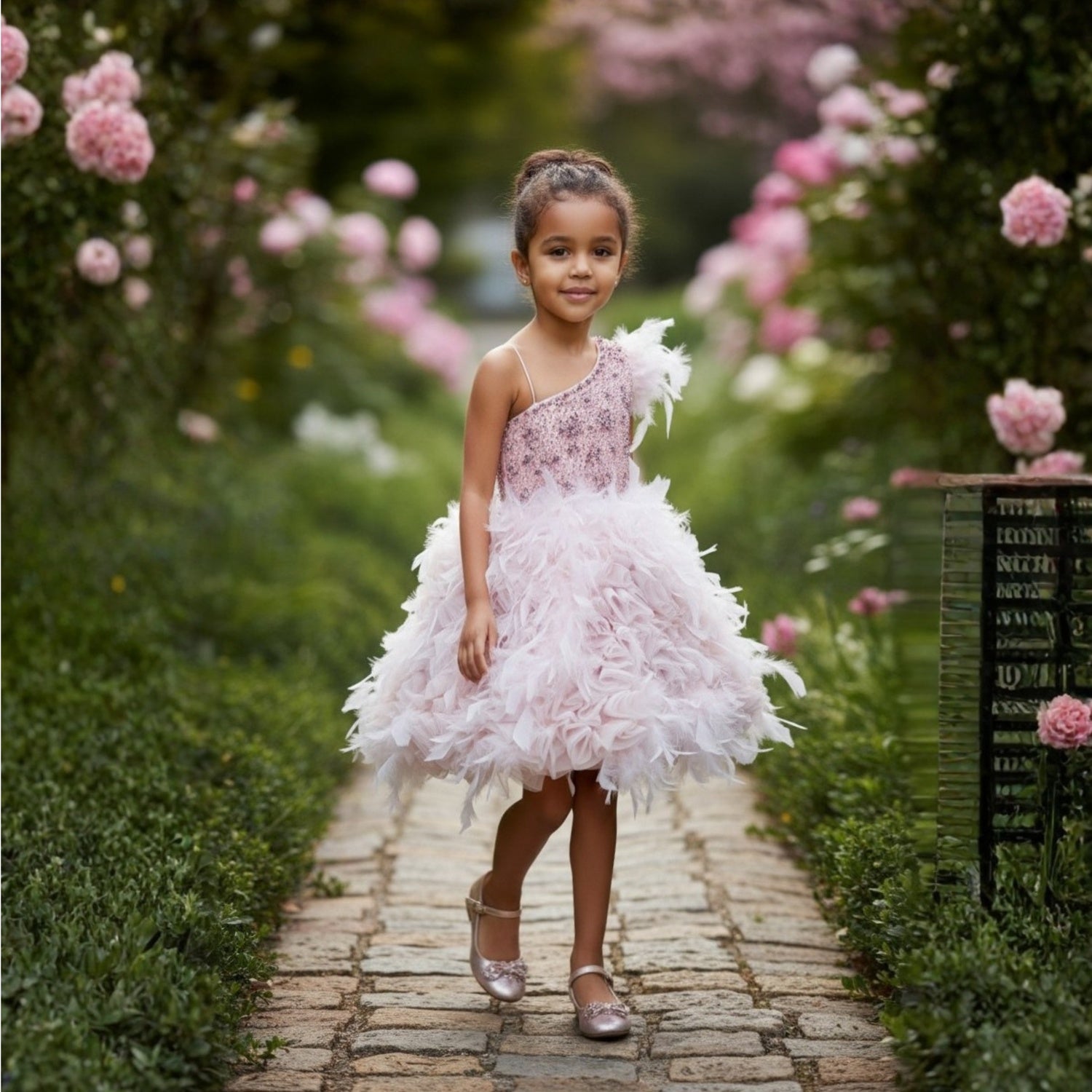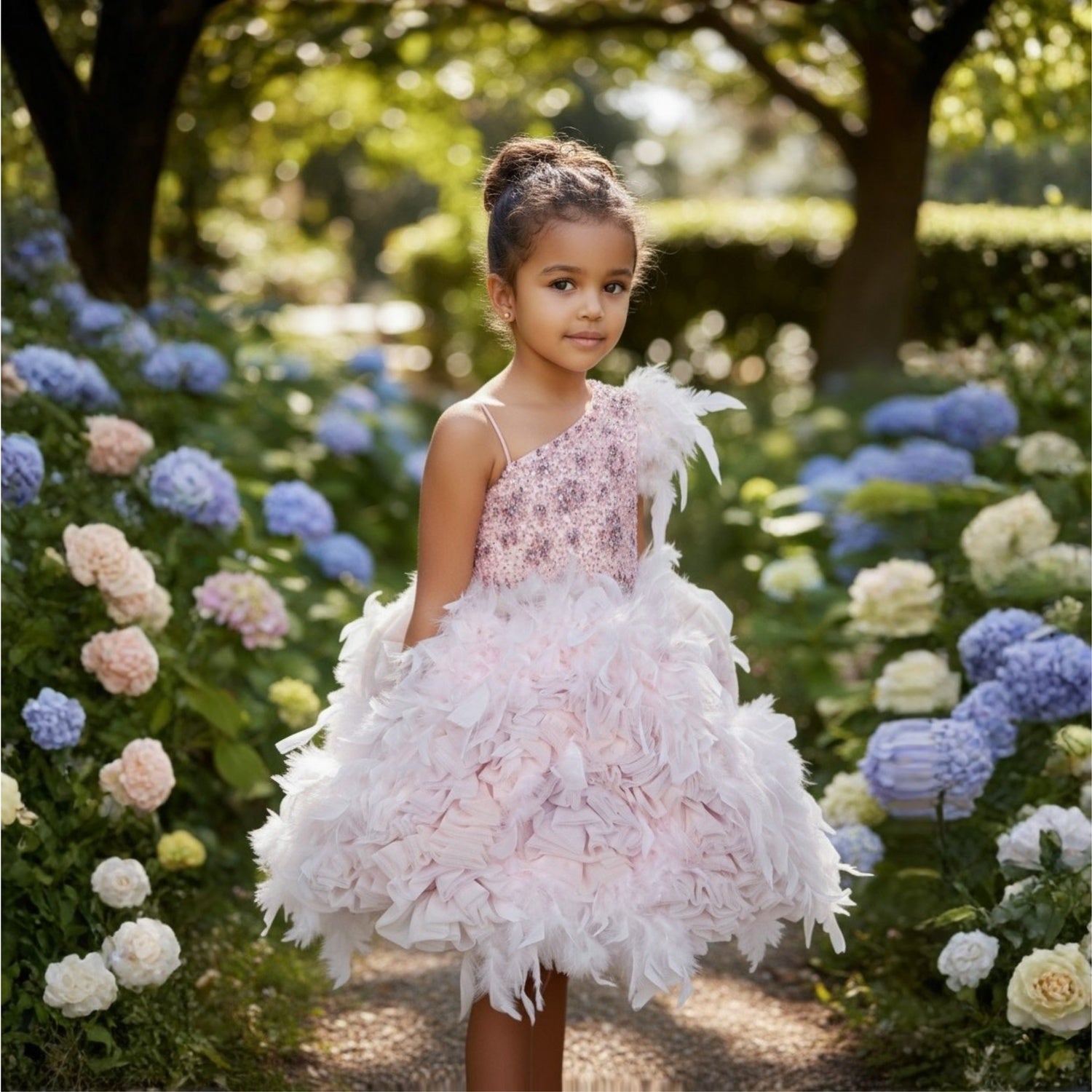 Sophisticated and whimsical, this one-shoulder dress is crafted in luxurious Dutch satin for a smooth, elegant drape. The frilled design adds movement and charm, while intricate crystal and feather embellishments lend a sparkling, playful touch. Perfect for special occasions, this dress blends opulence with creativity, ensuring your little one stands out with effortless grace and style.