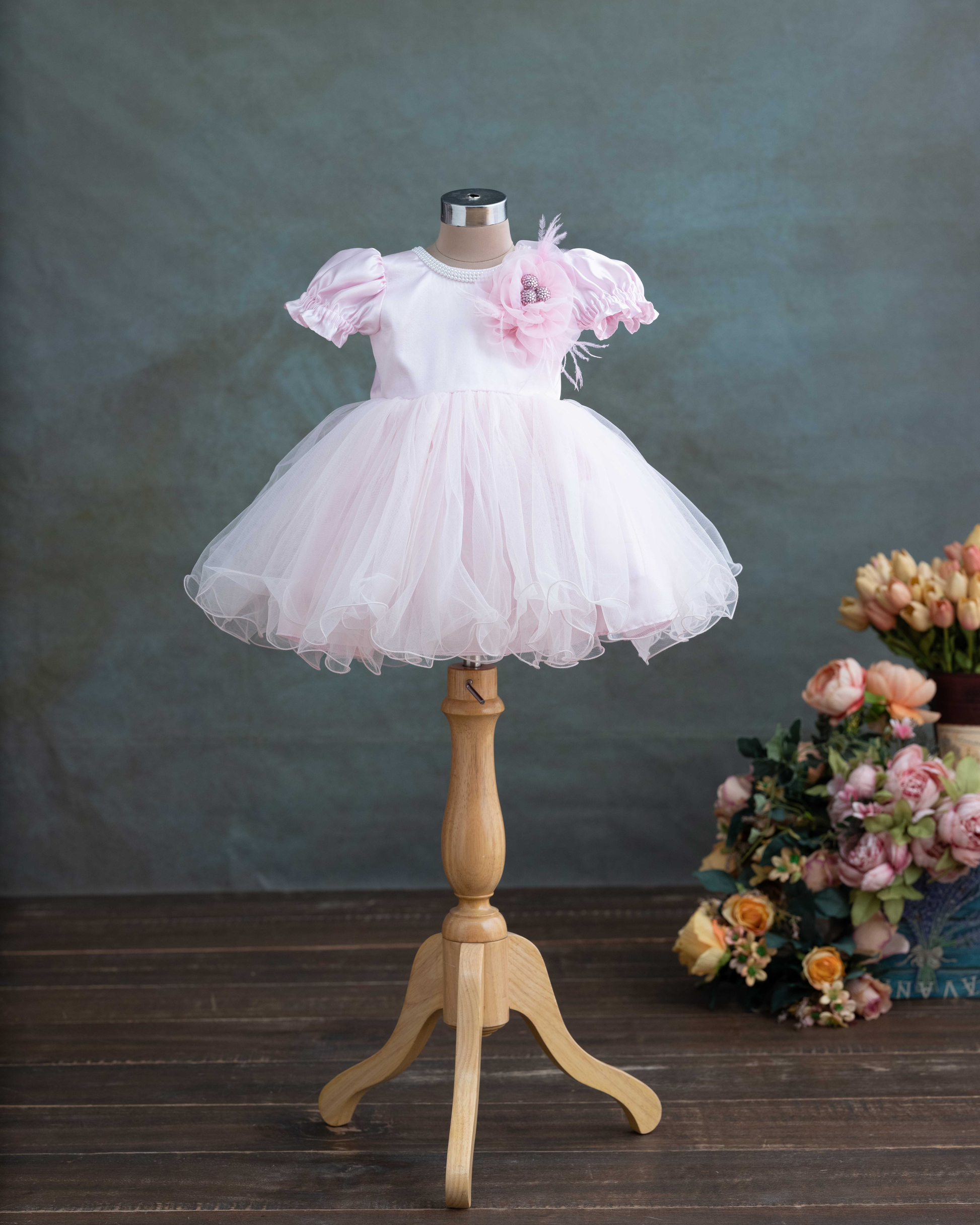 Elegant Dutch satin dress with a flowing net bottom, adorned with delicate net flowers and pearl work on the neckline. Perfect for birthdays, festive occasions, and special celebrations, combining comfort with luxury.