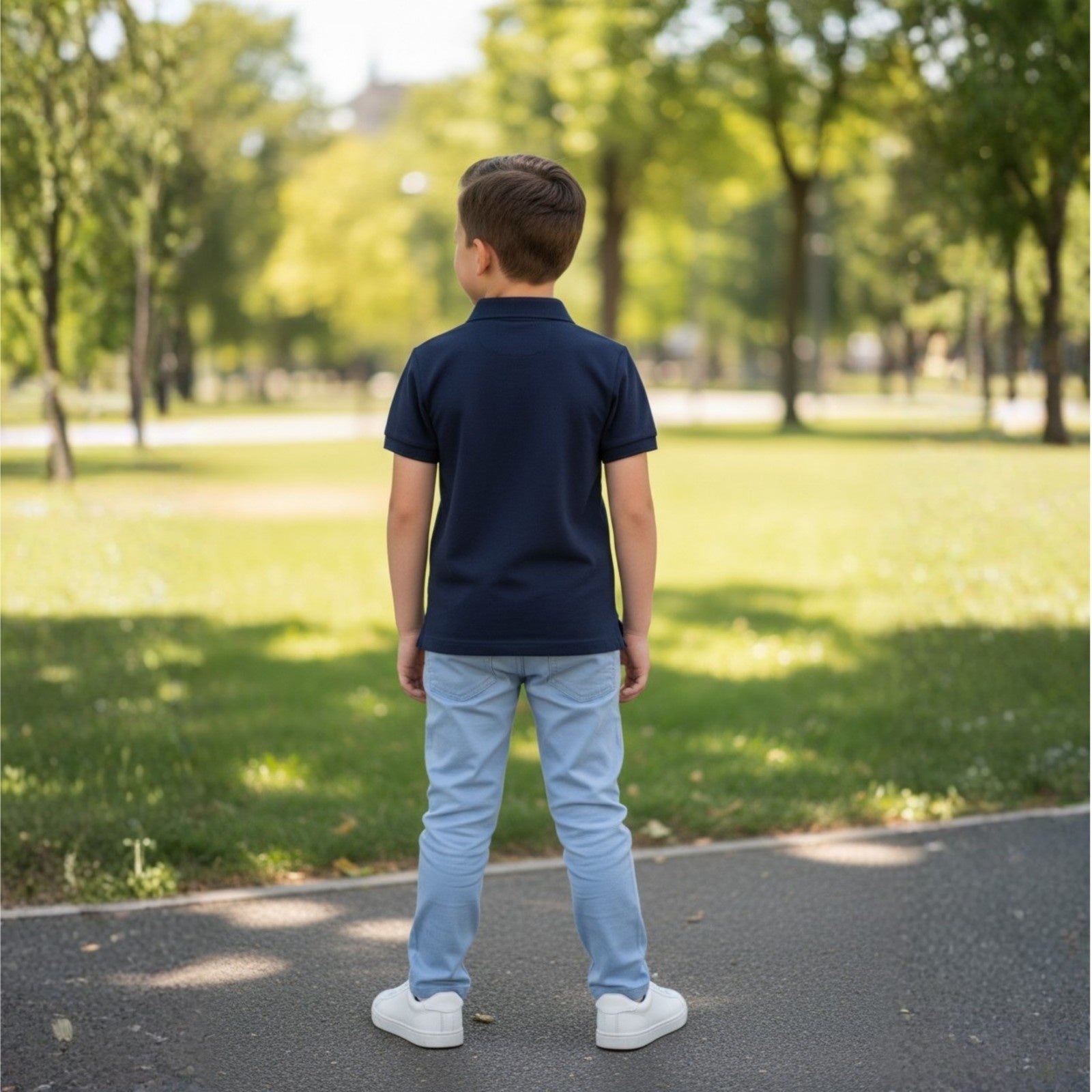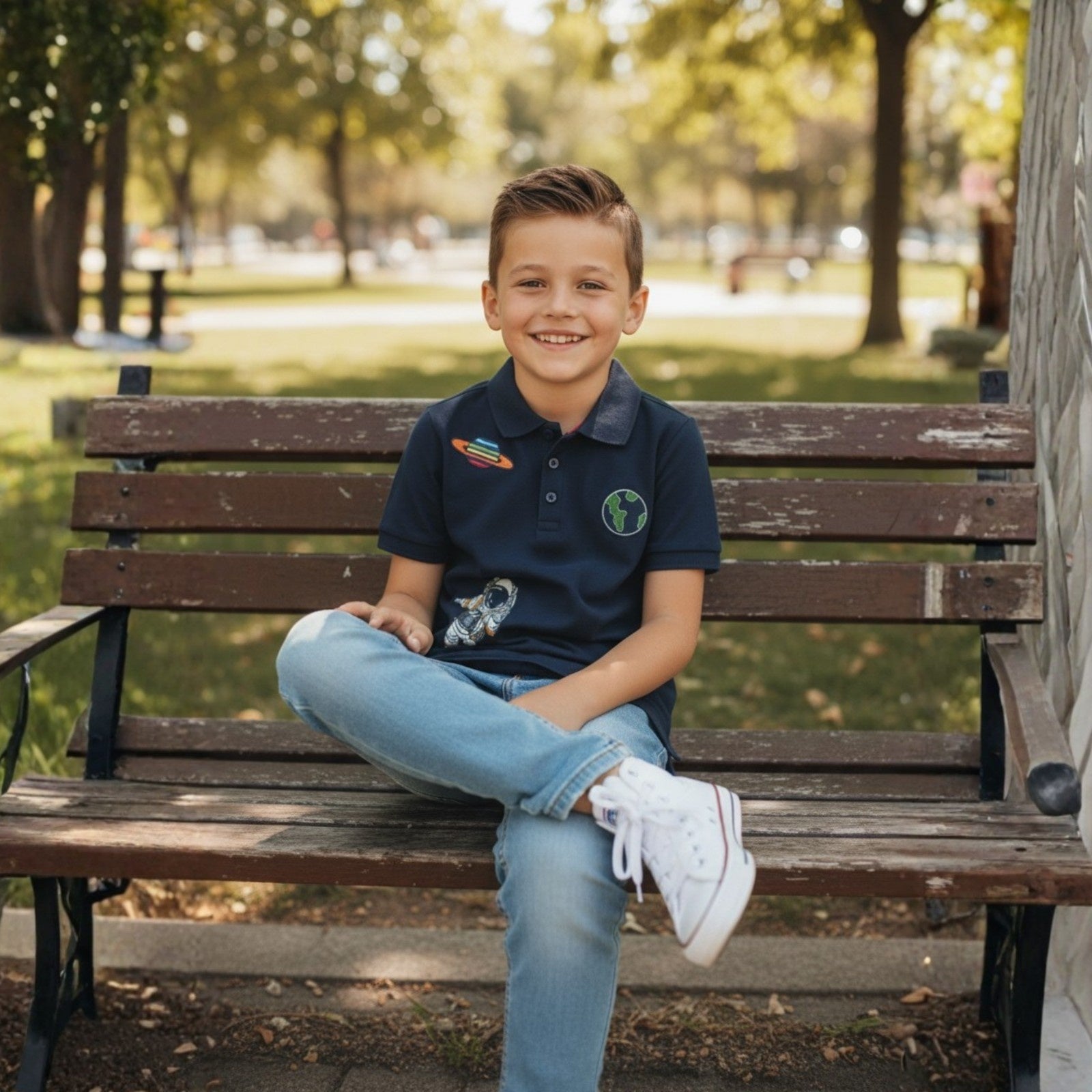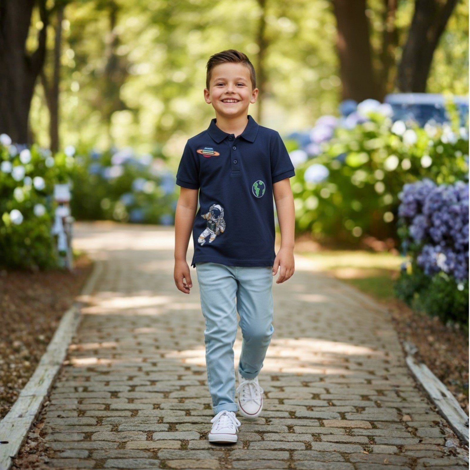 A cool navy-blue polo featuring fun space-themed patches, including an astronaut, planet, and Earth motif. Designed with a classic collar and button placket, this playful yet stylish piece adds a cosmic touch to everyday casual wear.