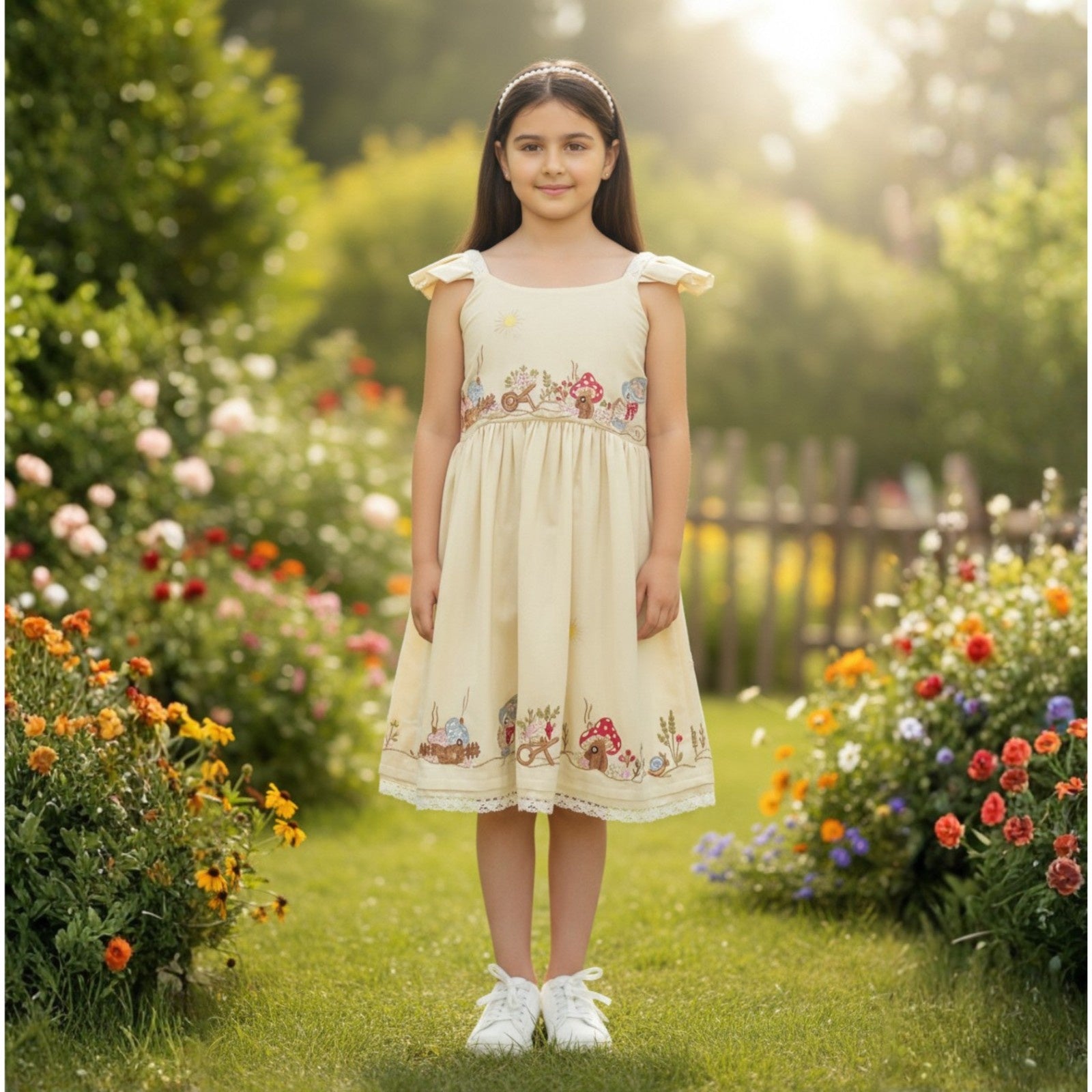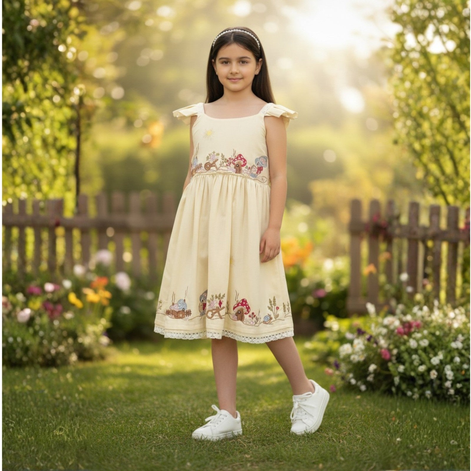 sundress with tie shoulders, lace hem, and charming embroidered woodland scene featuring mushrooms, snails, and garden motifs.
