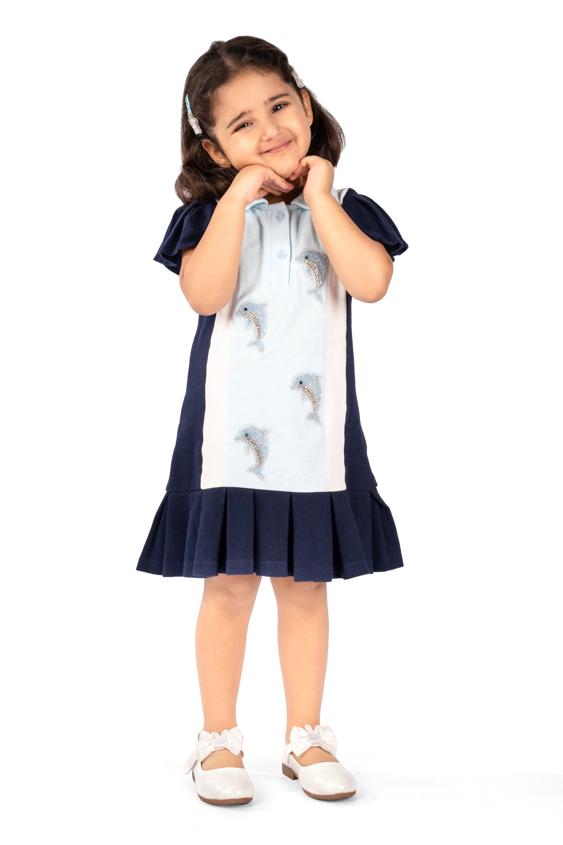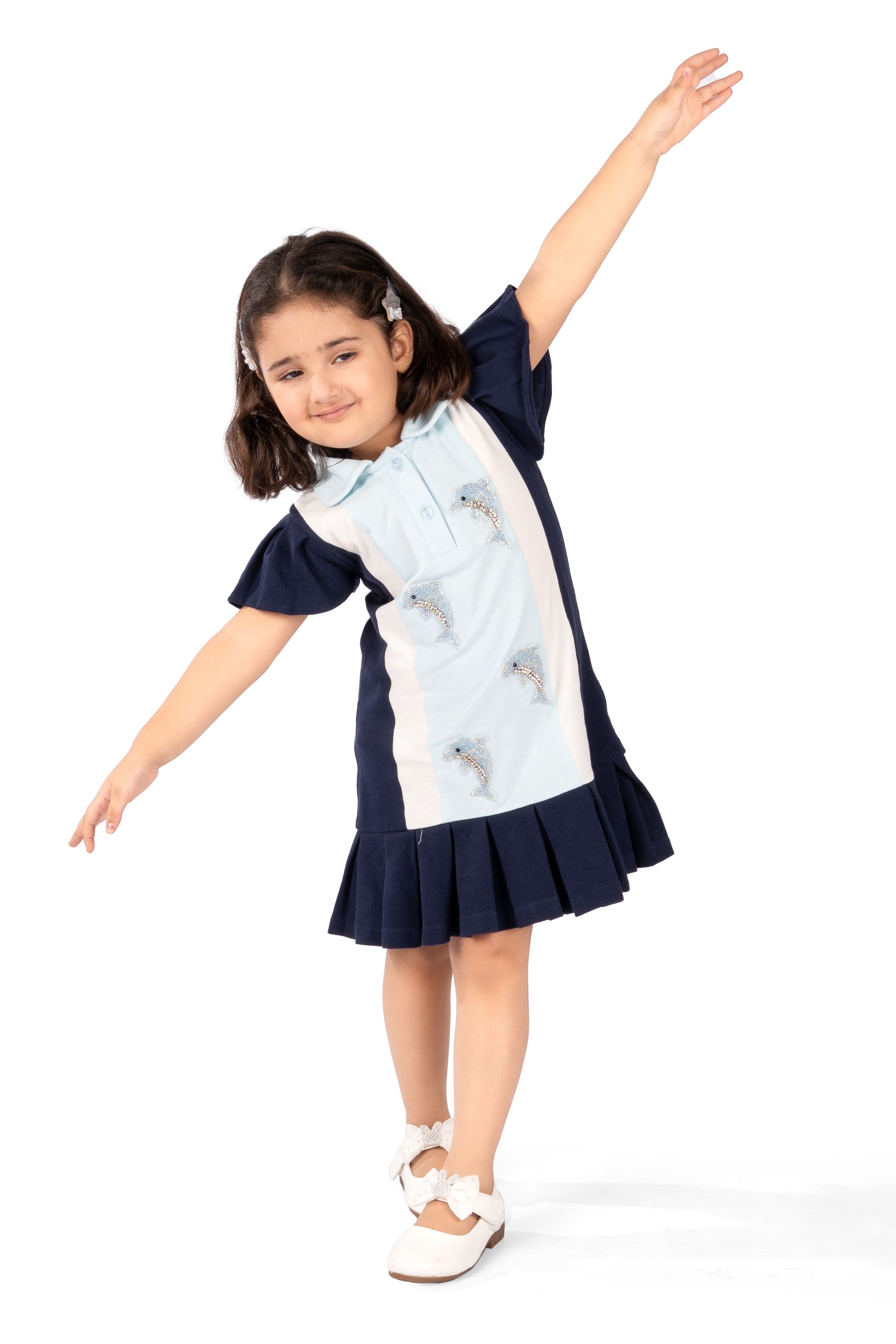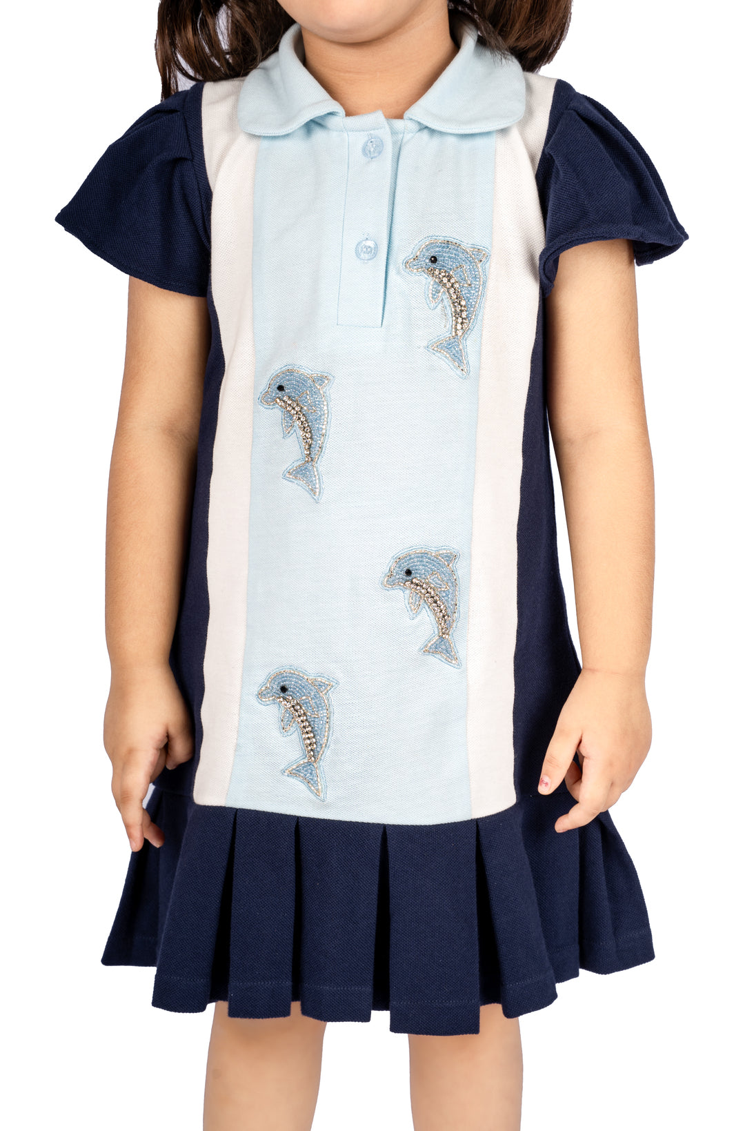 Add a splash of nautical charm to your wardrobe with this classic polo dress, featuring playful dolphin embroidery on the chest and hem. Crafted from soft, breathable cotton, it offers both comfort and style. Perfect for casual outings or beachside strolls, this dress brings a touch of whimsy to everyday wear.
