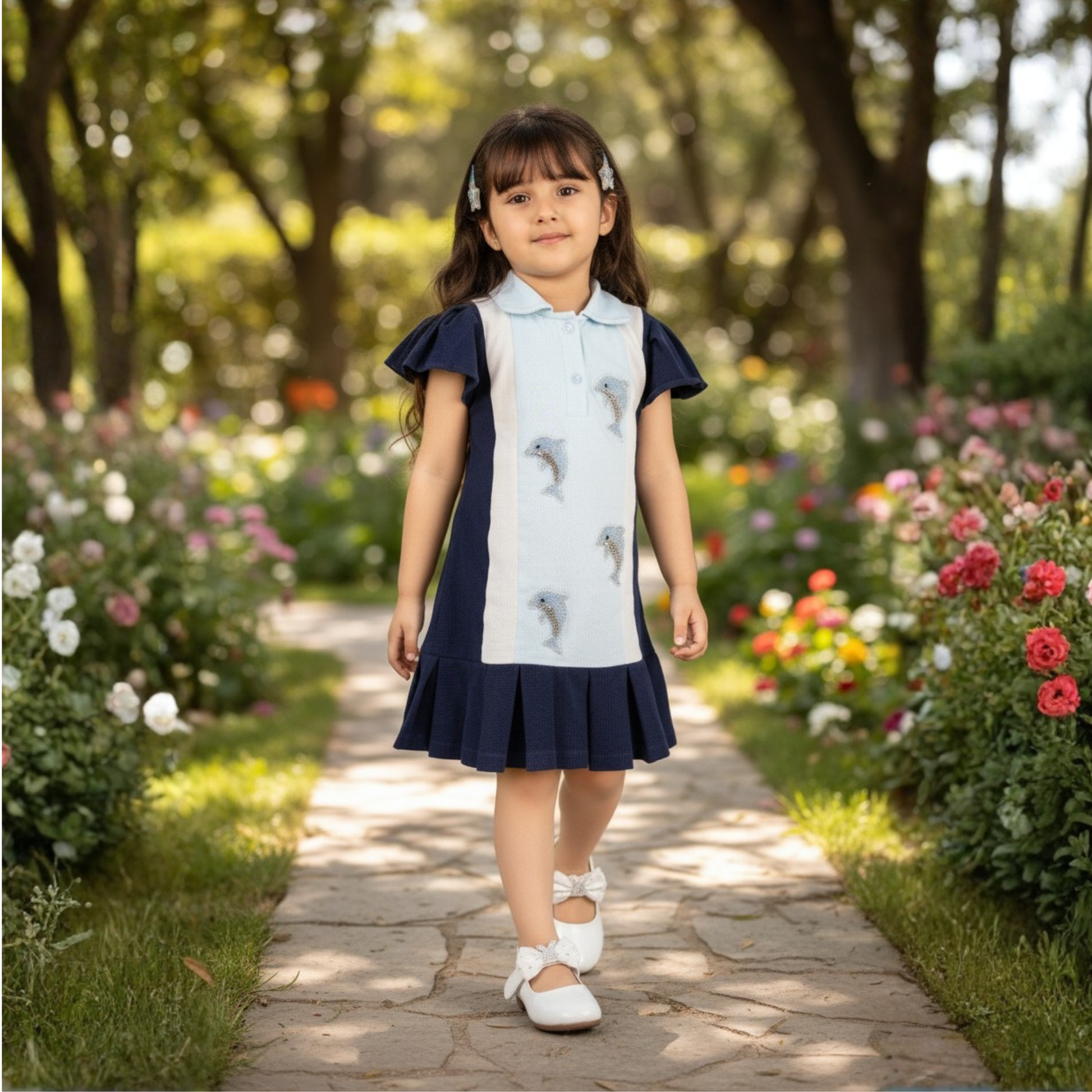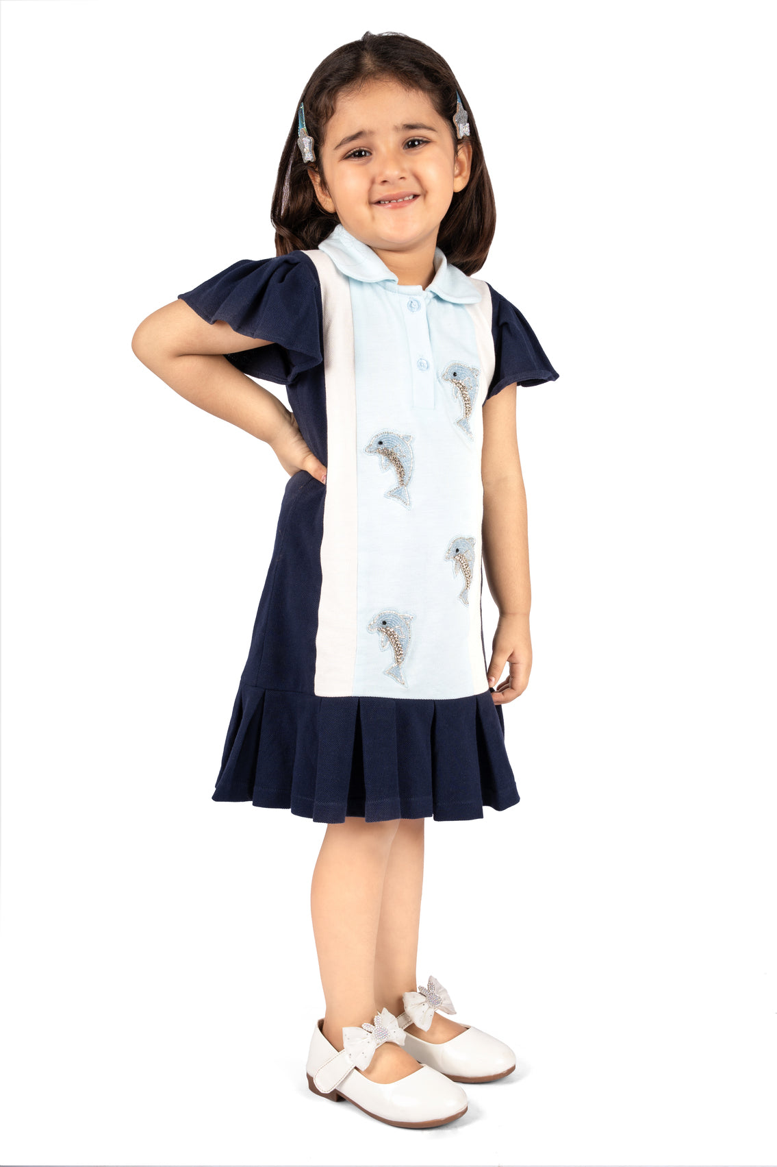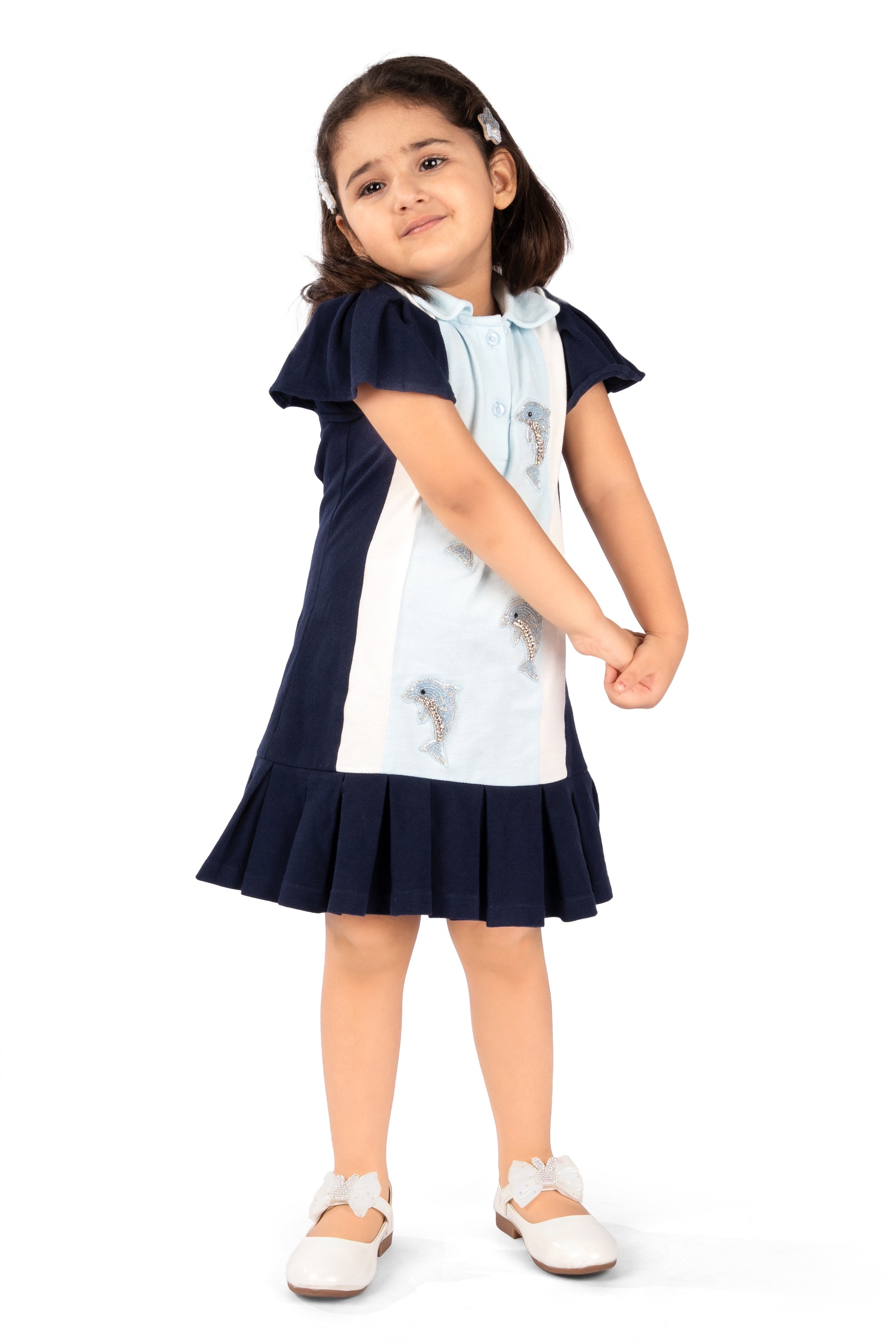 Add a splash of nautical charm to your wardrobe with this classic polo dress, featuring playful dolphin embroidery on the chest and hem. Crafted from soft, breathable cotton, it offers both comfort and style. Perfect for casual outings or beachside strolls, this dress brings a touch of whimsy to everyday wear.
