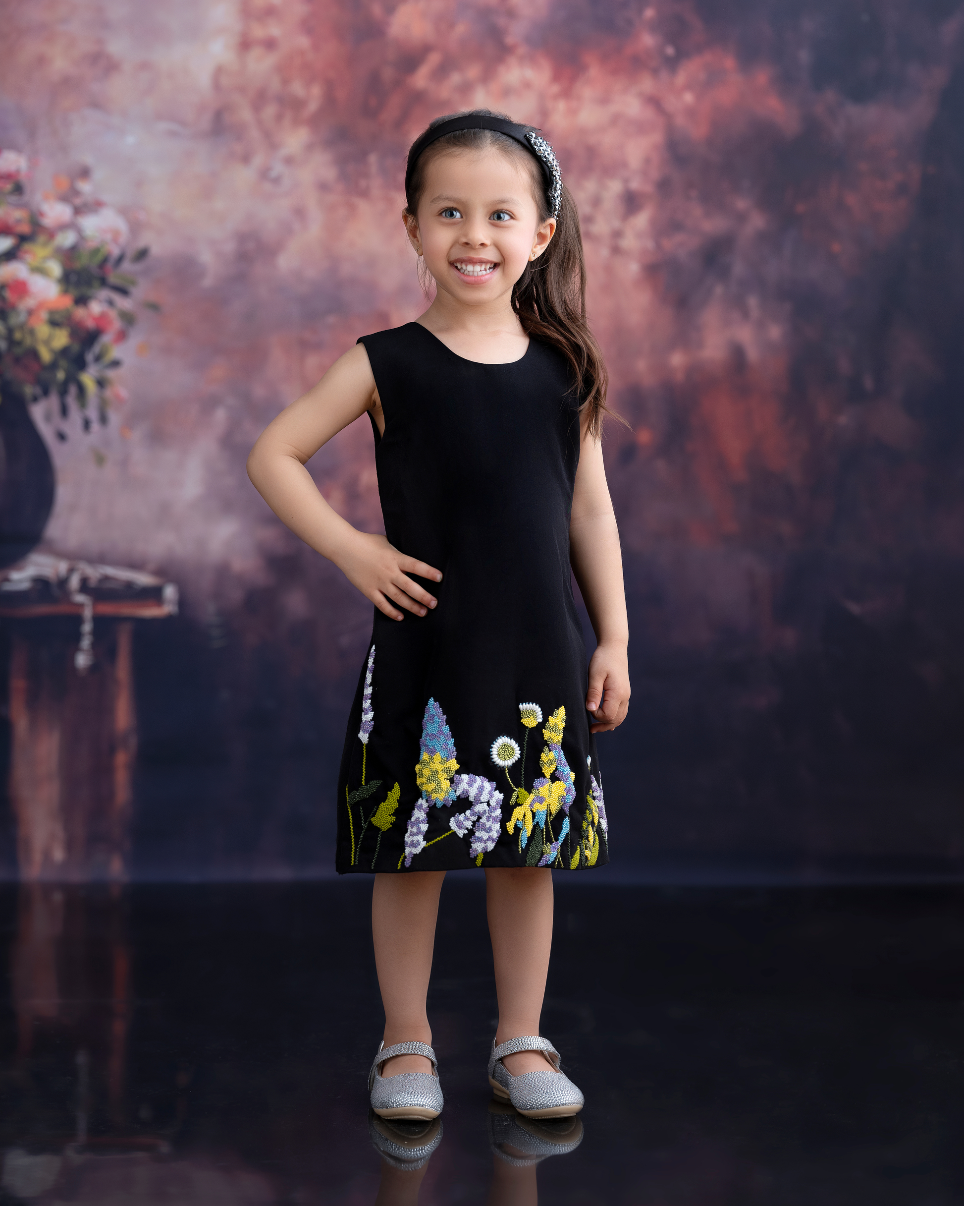 This elegant straight-fit kids’ dress features delicate thread embroidery across the bodice, offering a stylish and graceful look. Perfect for birthdays, parties, and festive occasions.