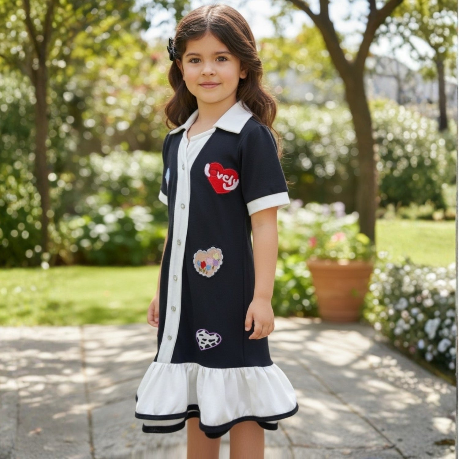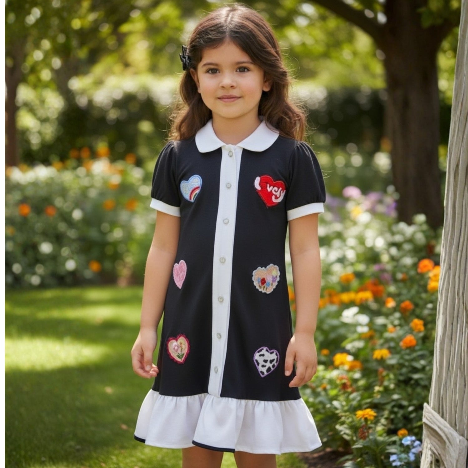 Black polo dress with a white collar and button front, featuring colorful heart patches and a contrast flared hem for a playful, stylish look.
