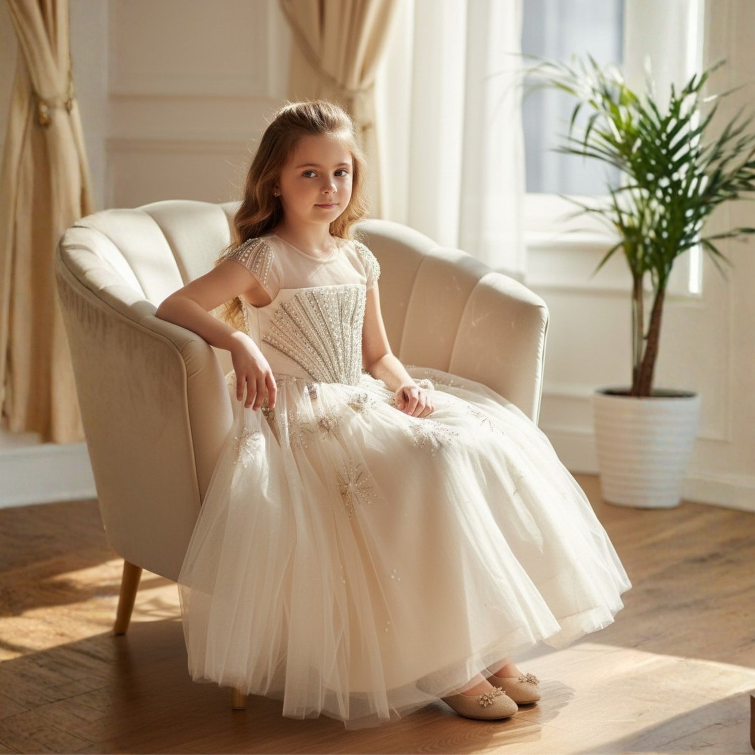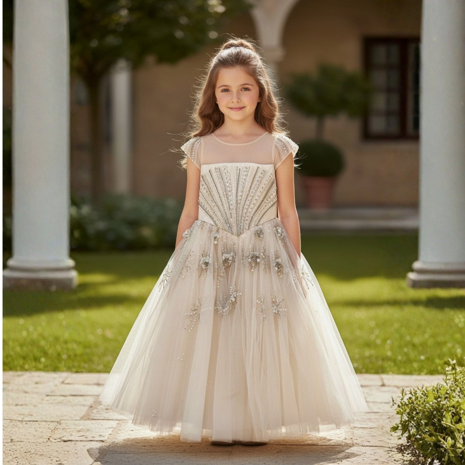 A beautiful champagne tulle gown featuring a delicately embellished bodice with intricate beadwork and soft cap sleeves. The full layered skirt is adorned with elegant 3D floral appliqus, creating a dreamy princess silhouette ? perfect for weddings, birthdays, and special celebrations..