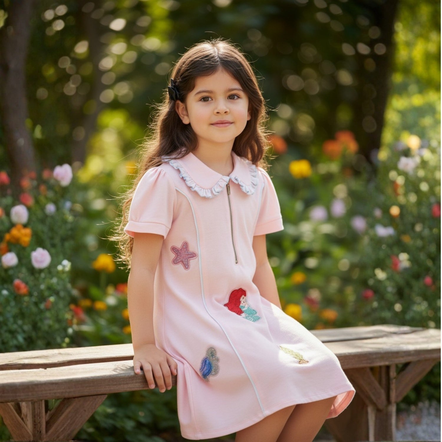 Soft pink polo dress with a delicate ruffled collar and front zip detail. Designed with short sleeves and embellished sea-inspired patches, creating a charming underwater theme perfect for little ocean lovers.