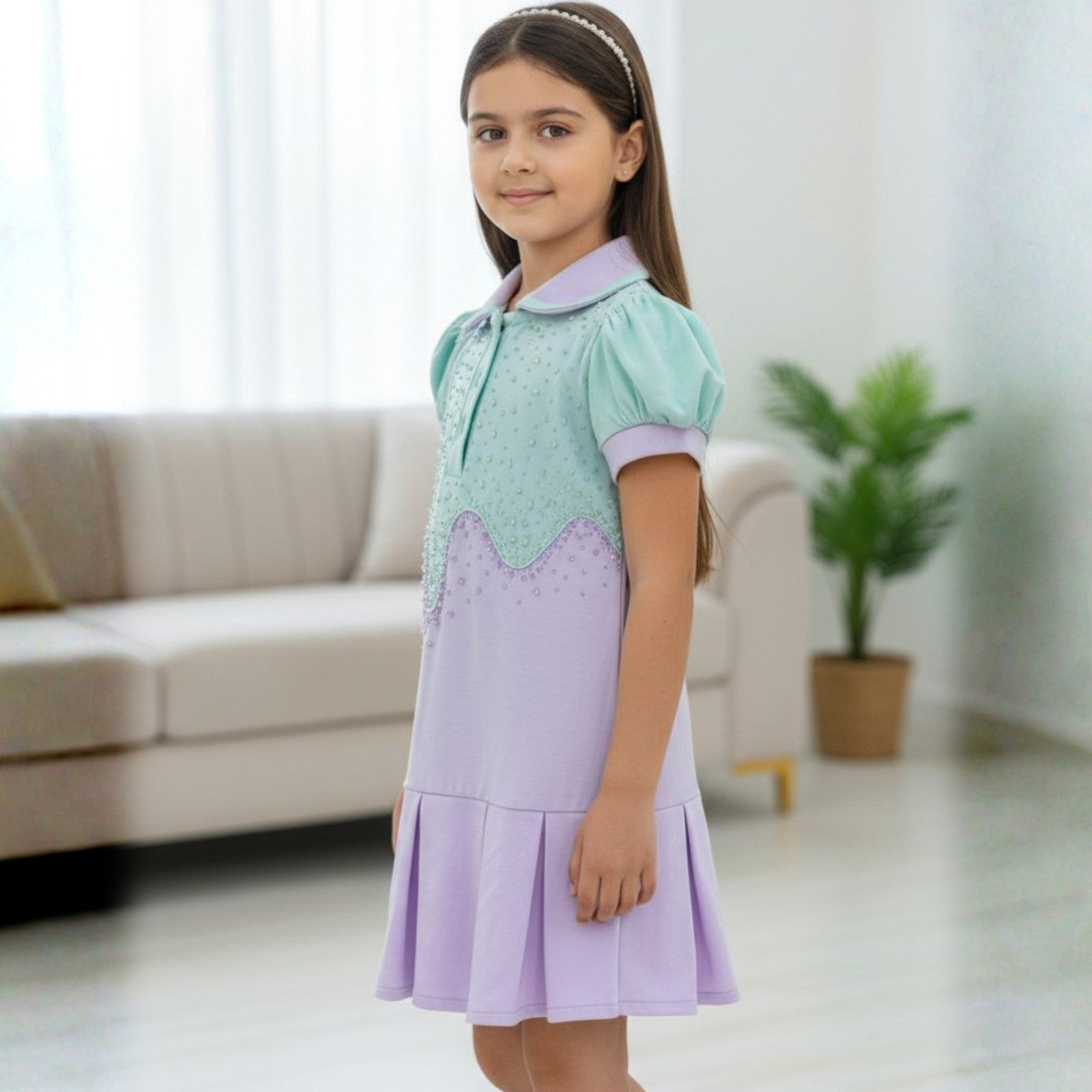 Pastel polo dress with a contrast collar and puff sleeves, featuring delicate embellishments and a playful wave-style color block design.