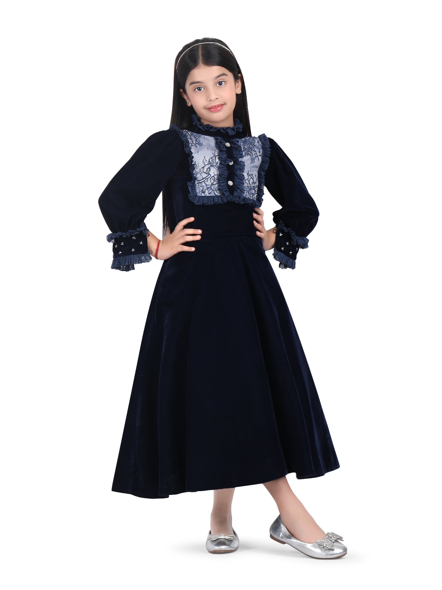 Crafted in luxurious velvet, this gown exudes elegance with its flowing silhouette. Delicate net detailing creates a dreamy contrast, while intricate beaded embroidery adds sparkle and sophistication. A perfect blend of richness and grace, designed for truly special occasions.