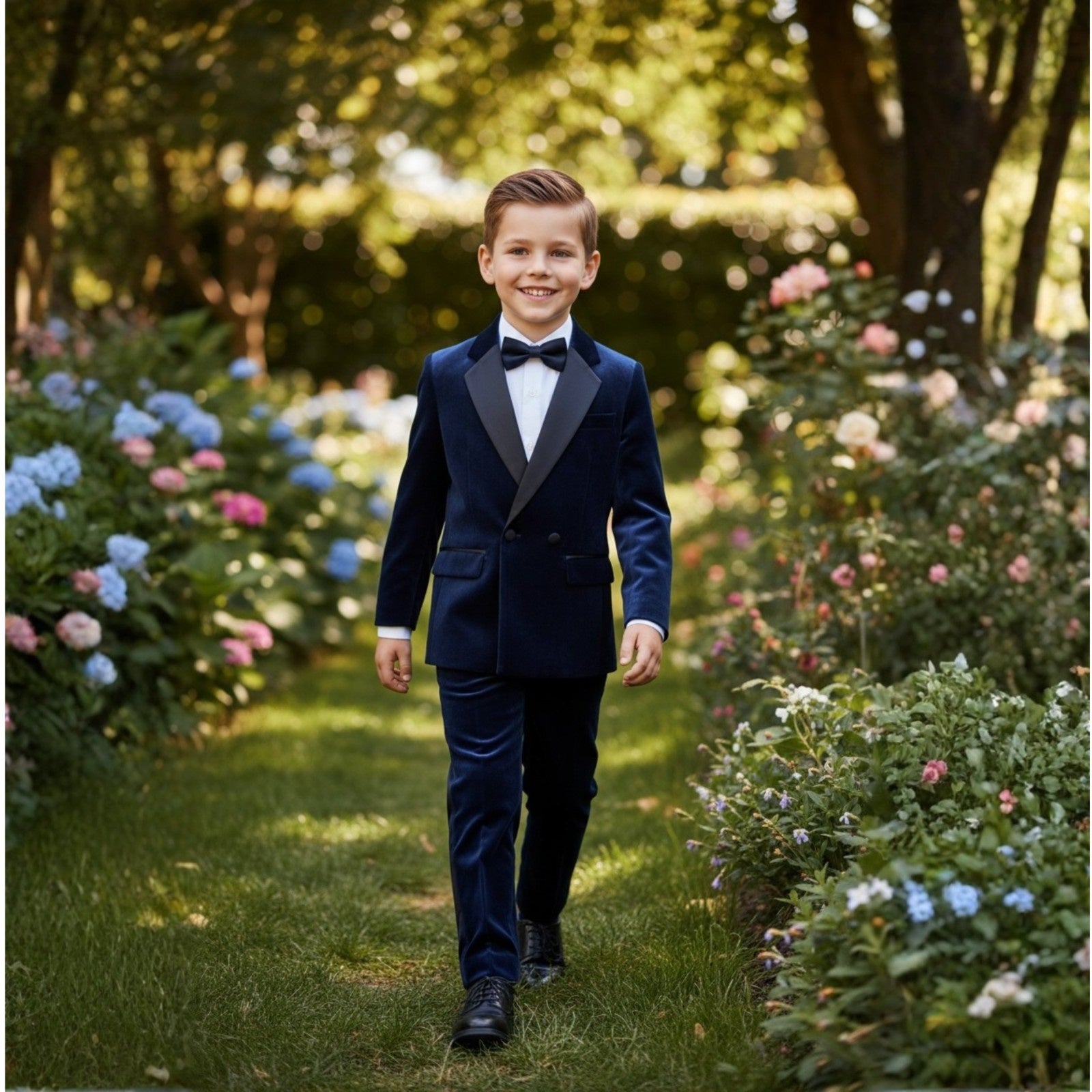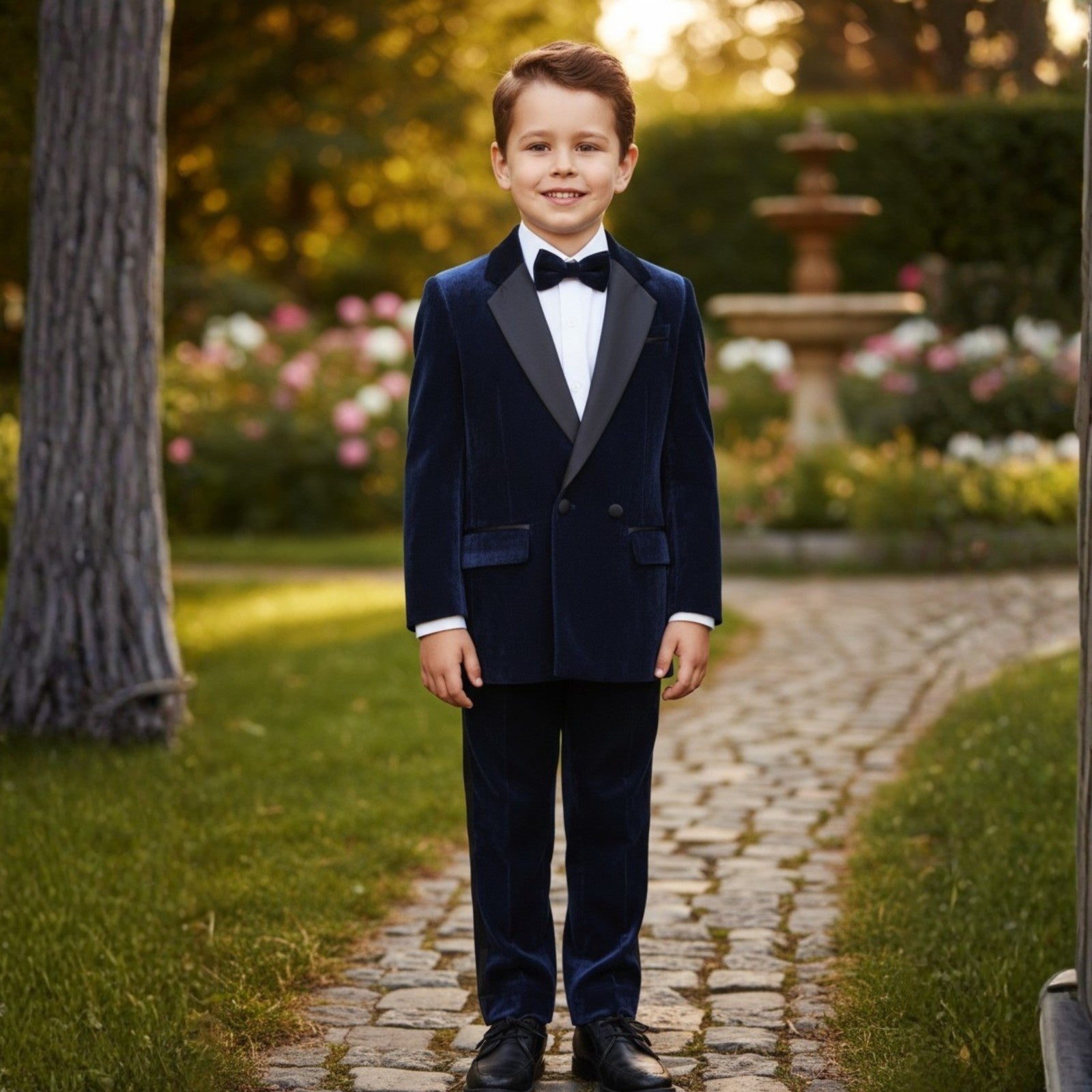 Dress your little in our Blue Velvet Tuxedo to bring the height of style. This statement piece, which combines exquisite tailoring and opulent fabric for a regal charm, is made for special occasions. Important attributes: 1. High-quality velvet fabric that is cozy, soft, and suitable for all-day wear 2. Traditional Royal Blue Hue: An ageless hue that radiates elegance and charm 3. Perfect Tailoring: For a dapper appearance, combine a structured fit with elegant detailing. 4. Complete Set: For a polished look, this set includes a jacket, pants, and a matching bow tie. 5. Adaptable Clothes: Perfect for formal occasions, weddings, and joyous festivities 6. Comfort & Style Combined: Carefully designed to strike the ideal mix between ease and elegance.