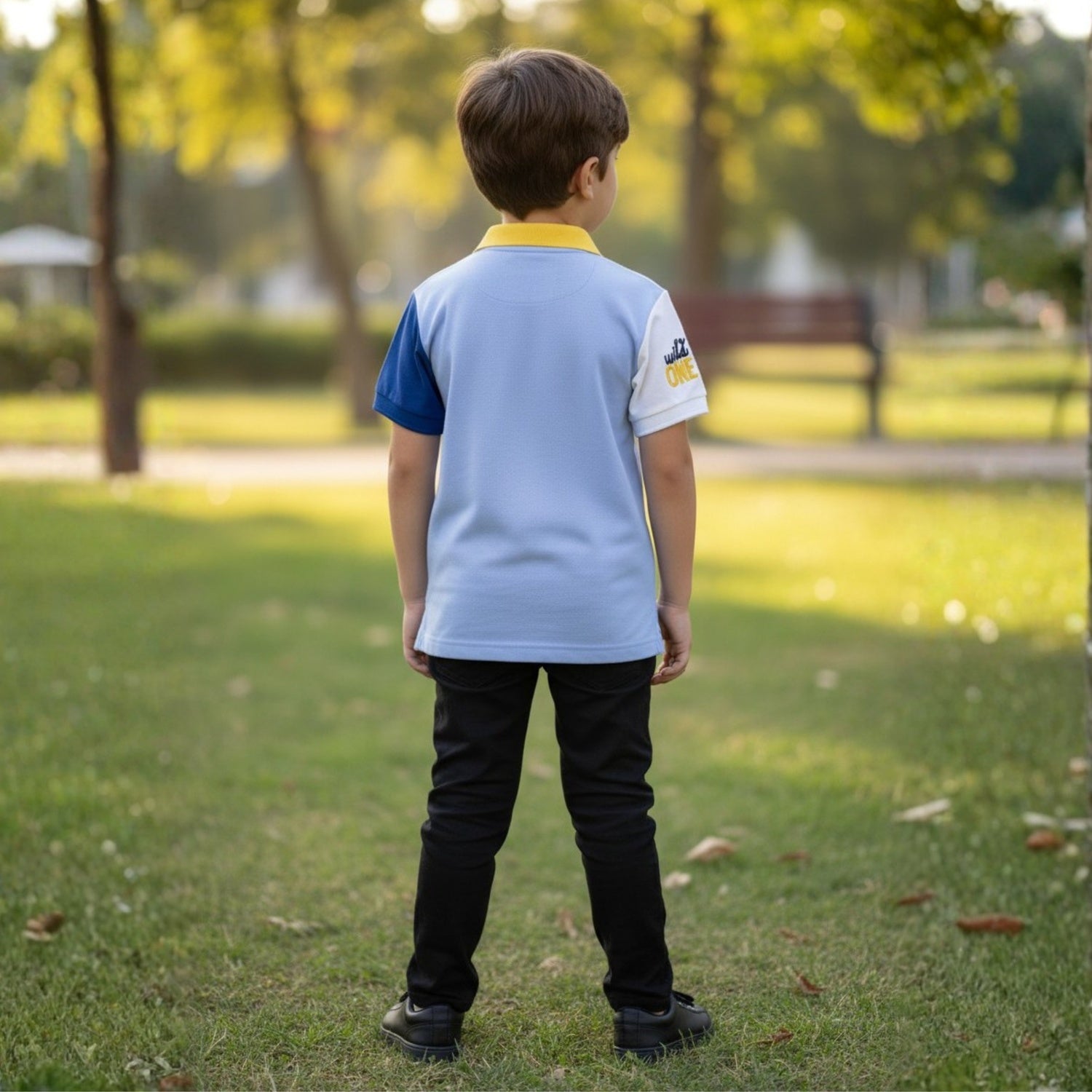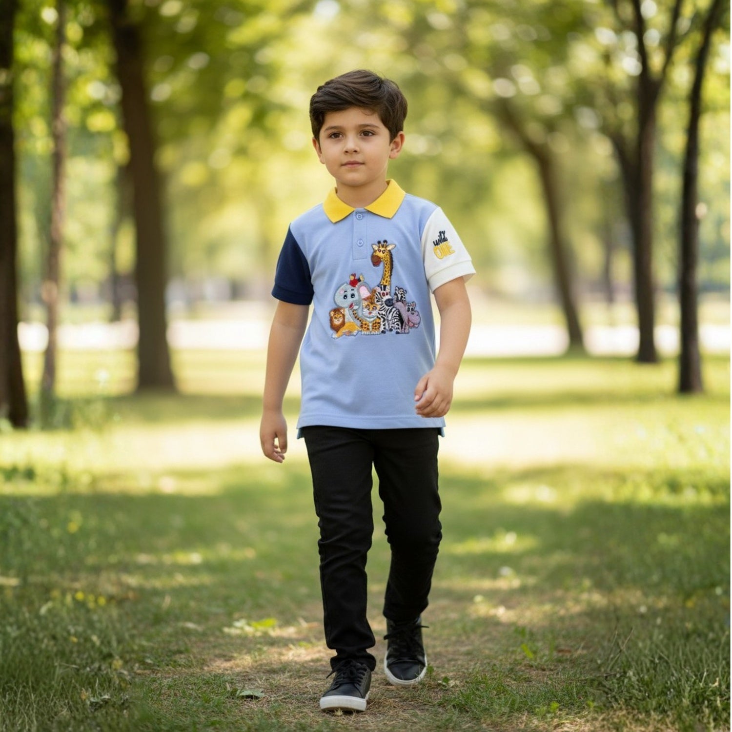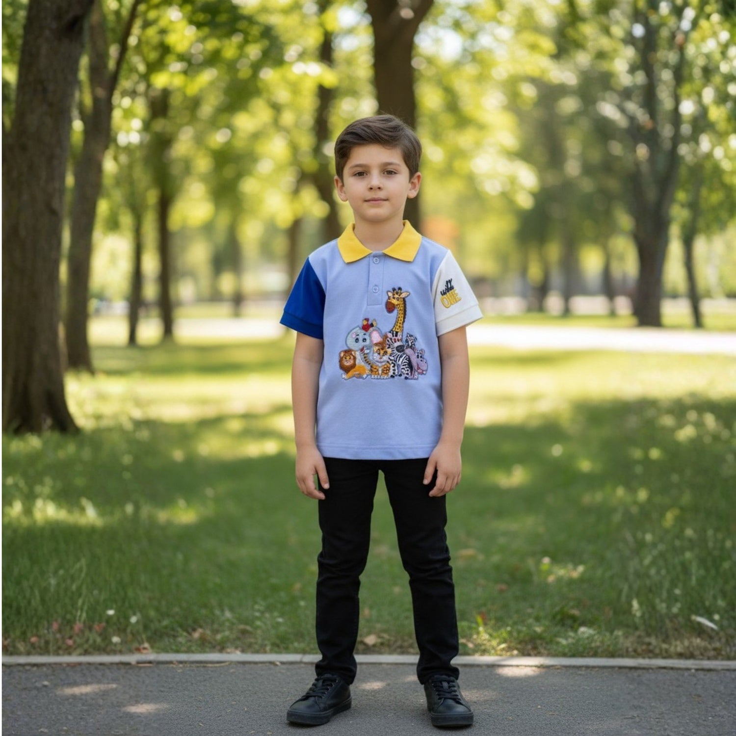 A charming light blue polo with a soft yellow collar and contrast sleeves, featuring an adorable jungle-themed print with a giraffe, lion, elephant, zebra, and hippo. Designed with a classic button placket, this playful and colorful piece adds a fun safari vibe to everyday wear.