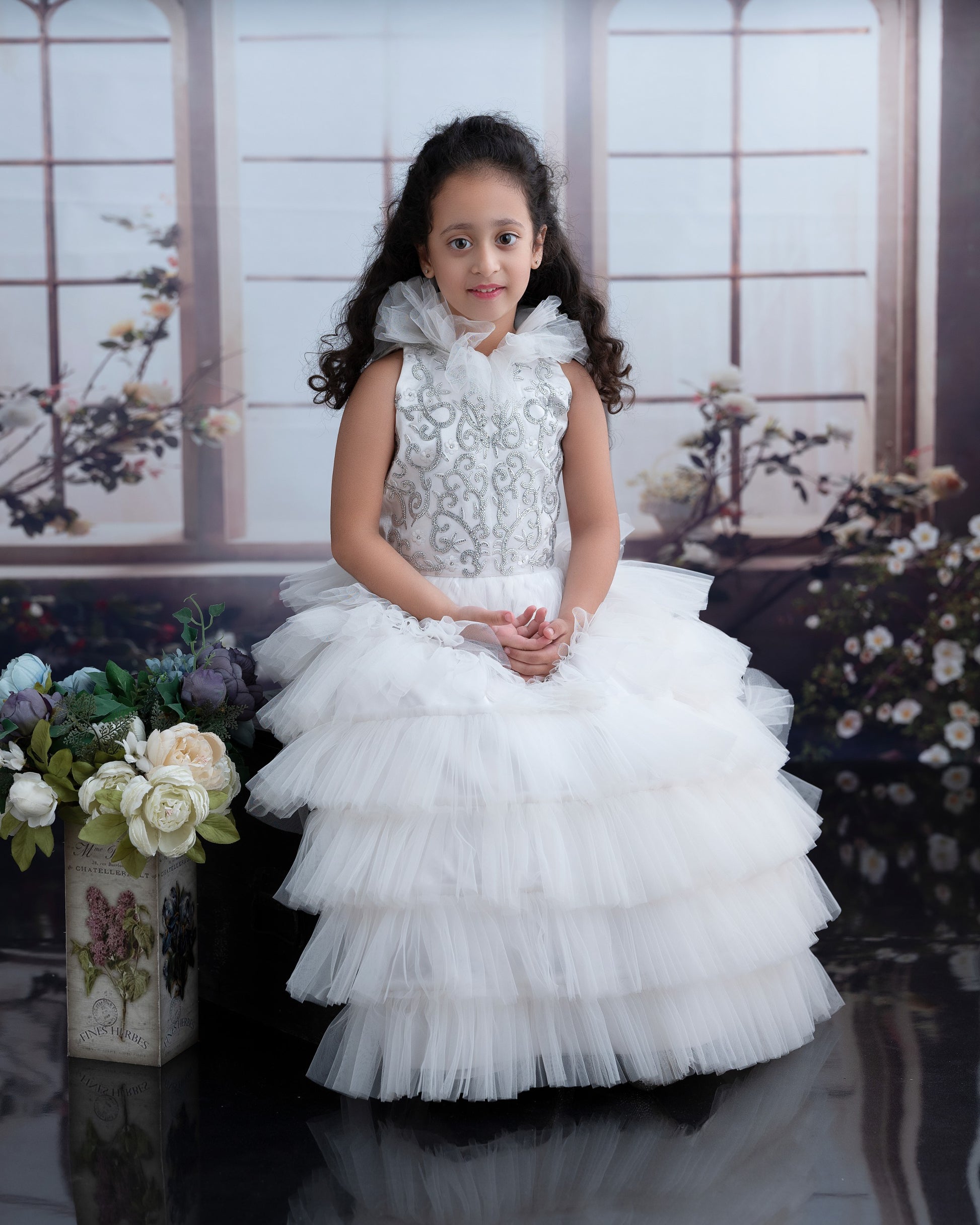 This elegant kids’ gown is crafted in soft net fabric and adorned with sparkling crystal embroidery on the bodice, creating a twirl-ready, couture-inspired look. Perfect for birthdays, parties, and special occasions.
