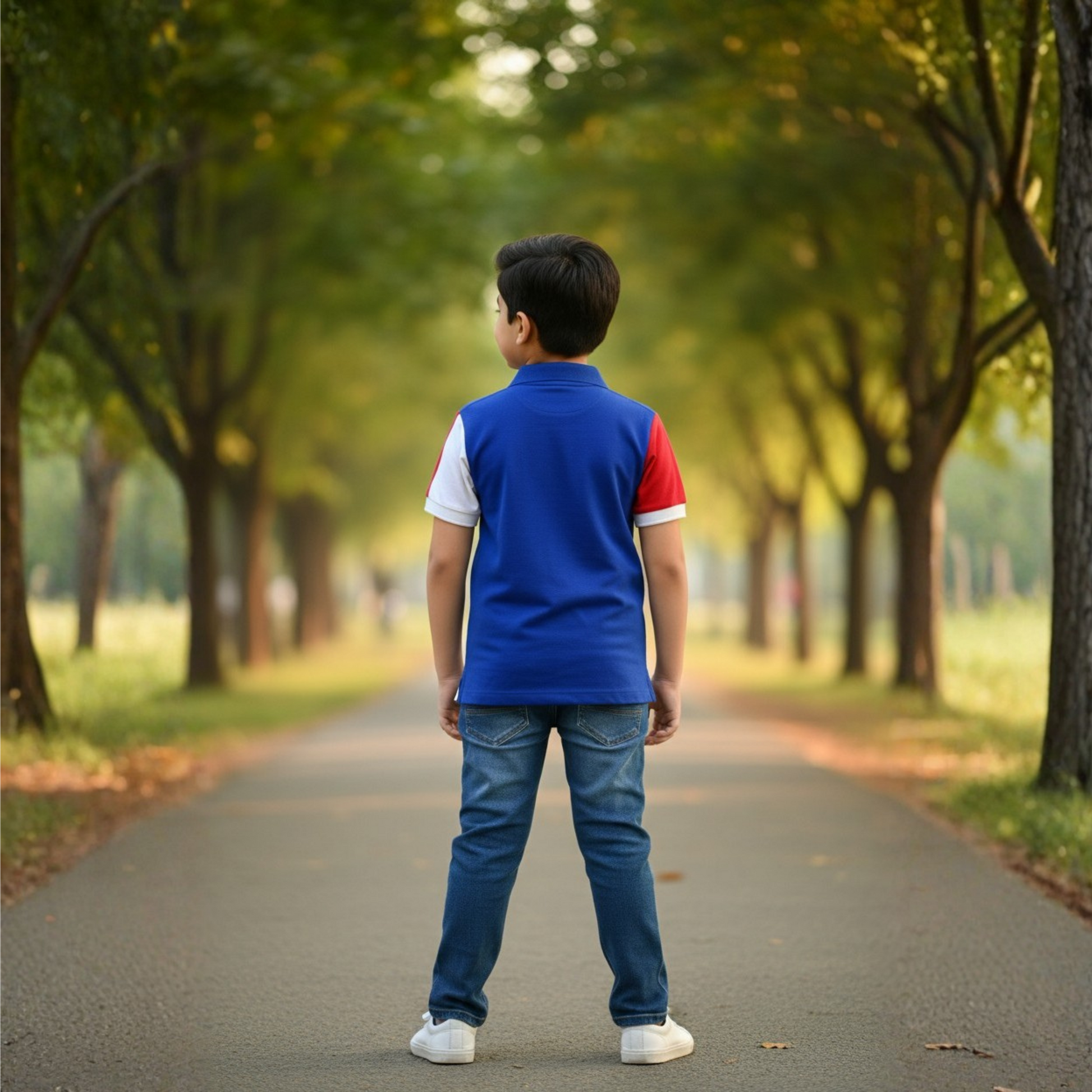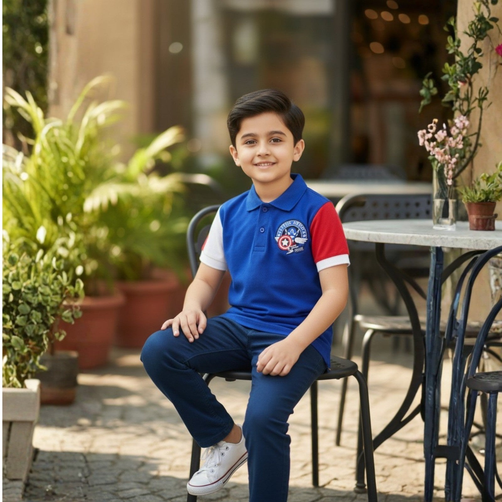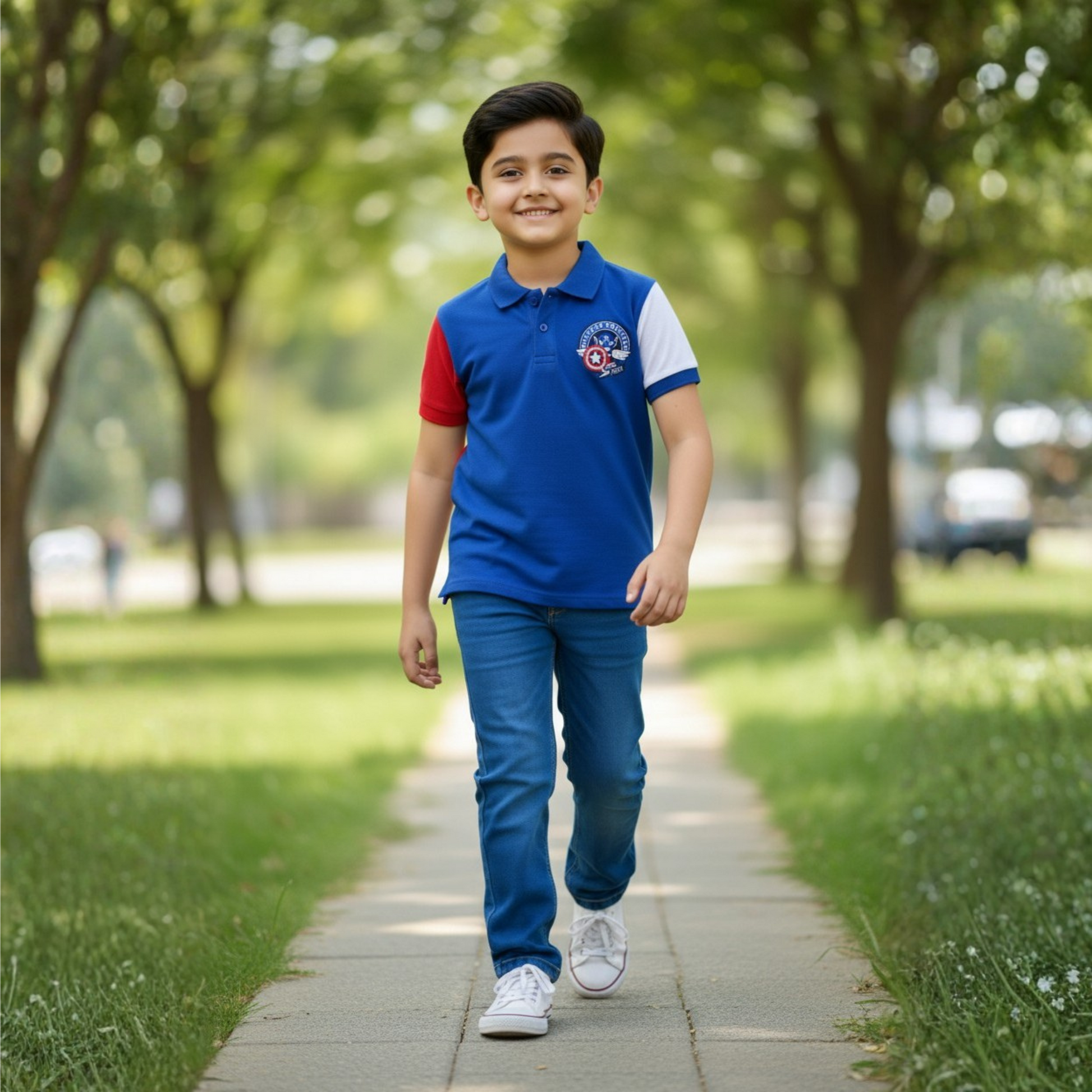 A bold blue polo featuring contrasting white and red sleeves for a sporty, color-block look. Accented with a striking shield-style patch on the chest and a classic collar with button placket, this polo adds a cool, athletic vibe to everyday wear.