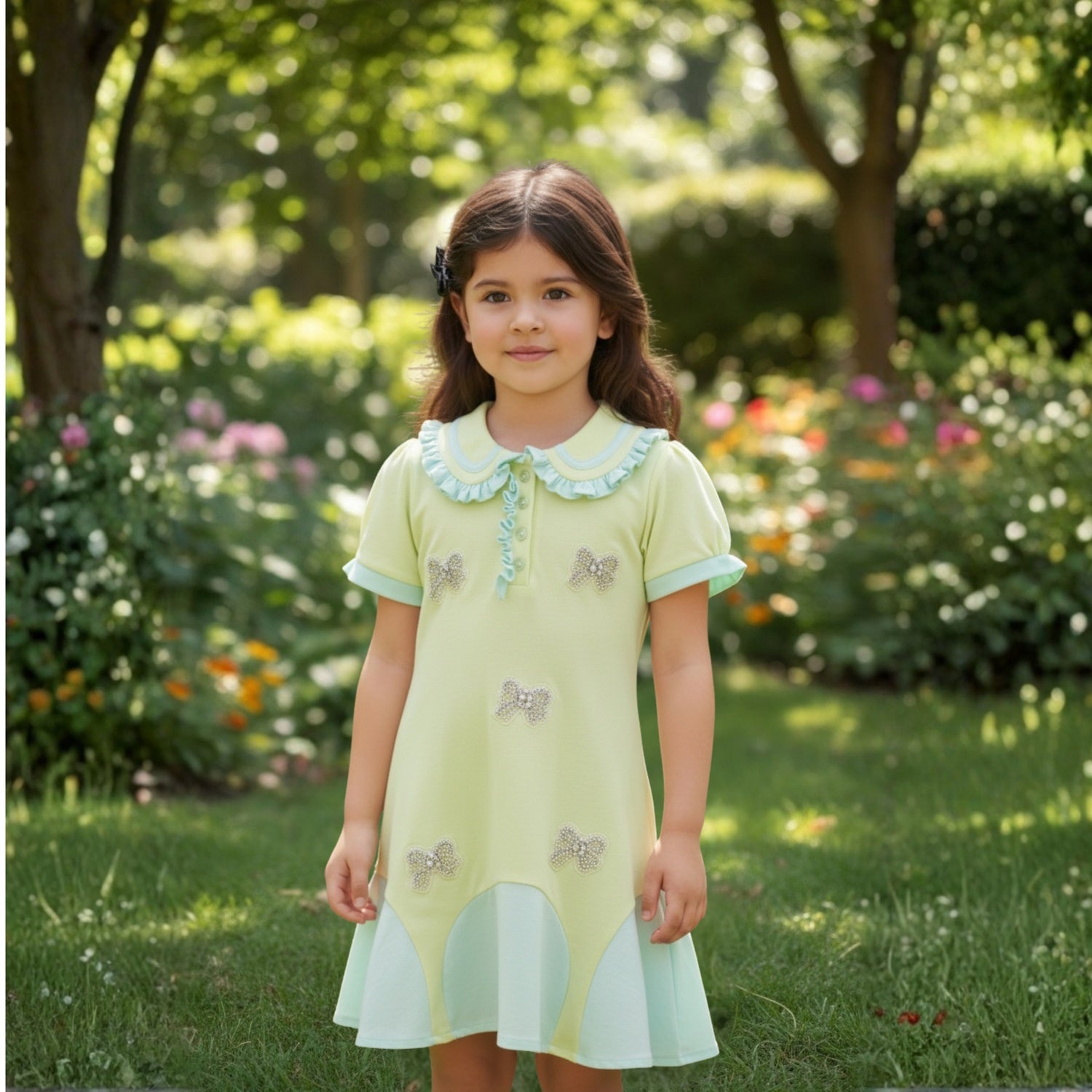 Sweet pastel polo dress featuring a ruffled collar, contrast trim, and sparkling bow embellishments. Finished with a flared hem for an extra touch of charm..