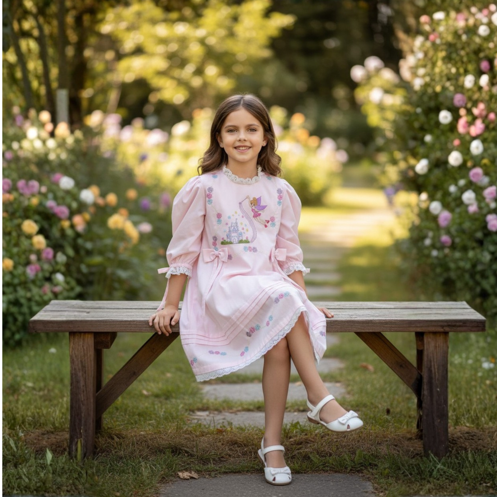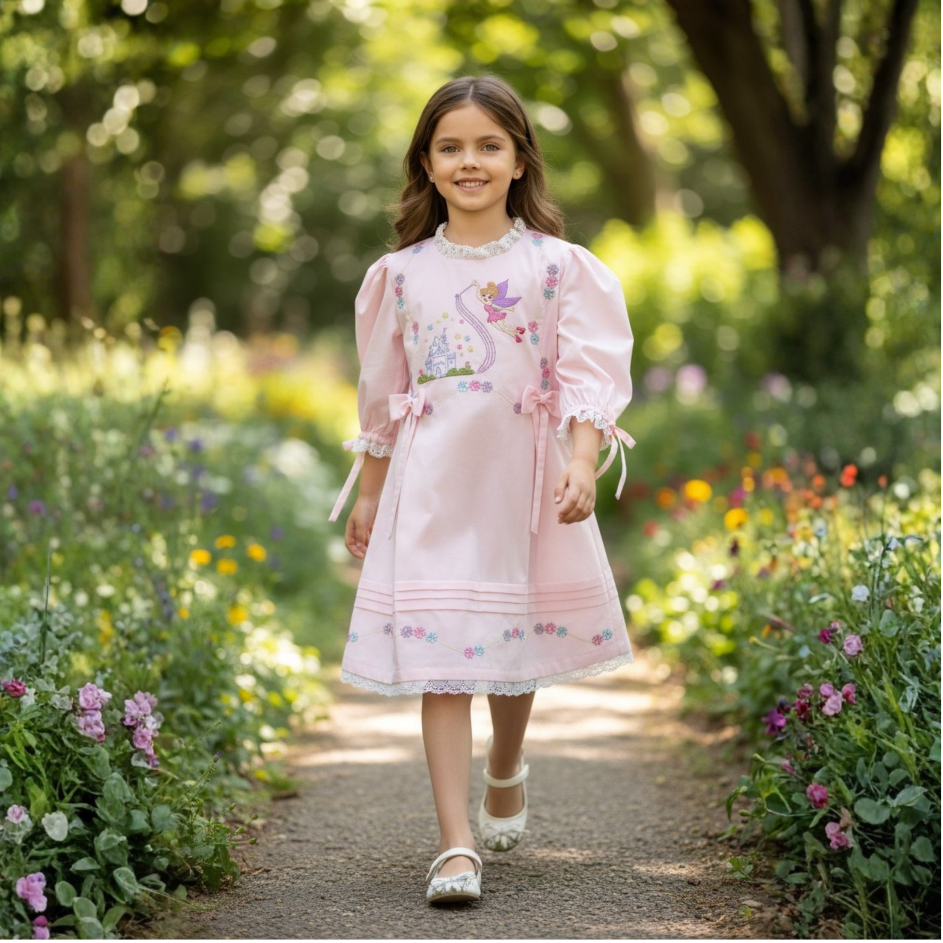 Blush pink dress with lace trim, puff sleeves, and charming fairy and castle embroidery. Finished with floral details and sweet side bows for a dreamy look.