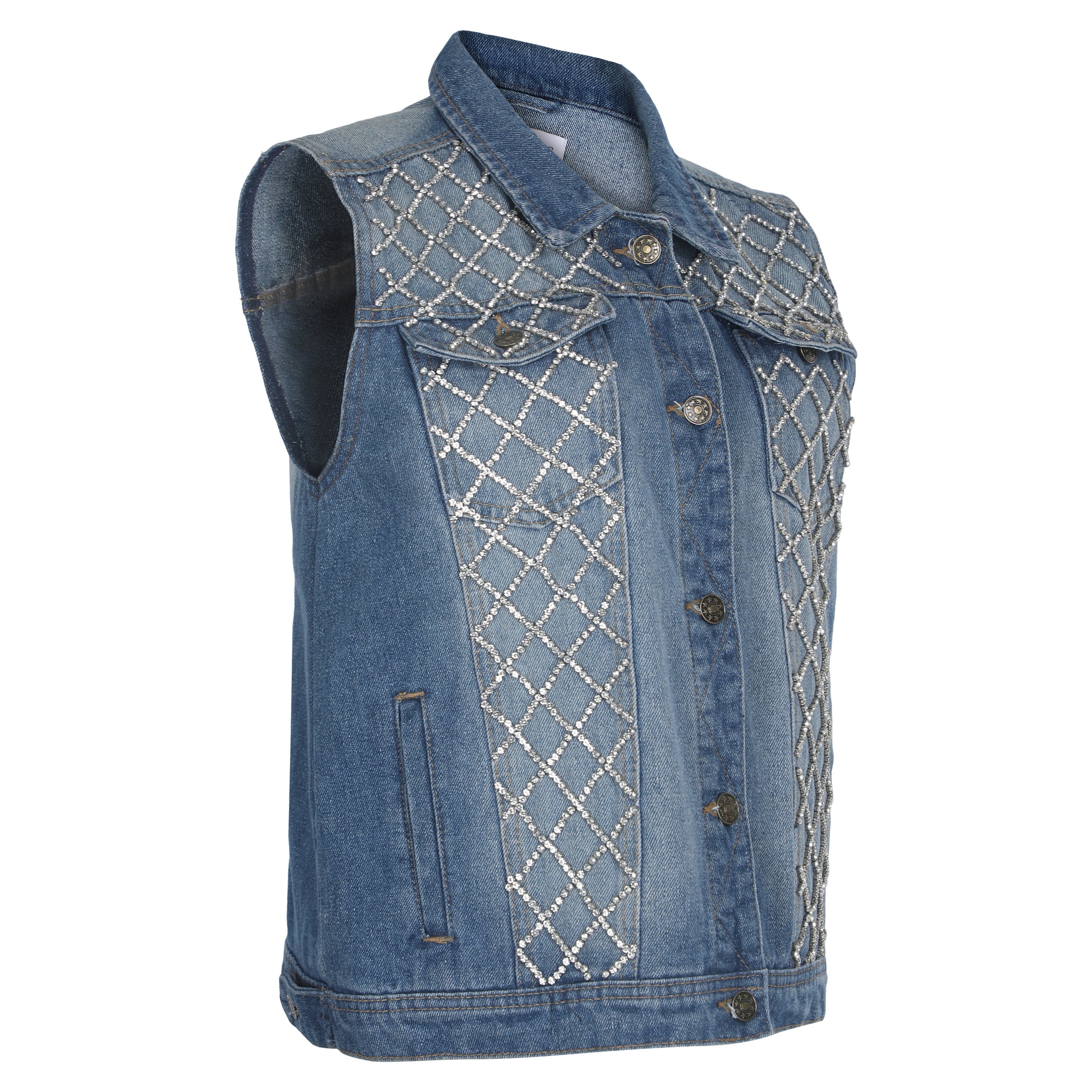 Elevate your denim game with our Sleeveless Denim Jacket, adorned with shimmering crystal embellishments for a touch of glamour. This chic piece blends edgy style with a hint of sparkle, making it a must-have for bold fashion statements. Key Features: 1. Premium Denim Fabric – Durable, stylish, and comfortable for all seasons. 2. Dazzling Crystal Embellishments – Adds a glamorous touch to a classic piece. 3. Sleeveless & Versatile – Perfect for layering over tops, dresses, or co-ord sets. 4. Trendy & Comfortable Fit – Designed for a flattering, modern silhouette. 5. Perfect for Any Occasion – Ideal for casual outings, parties, and statement street style.