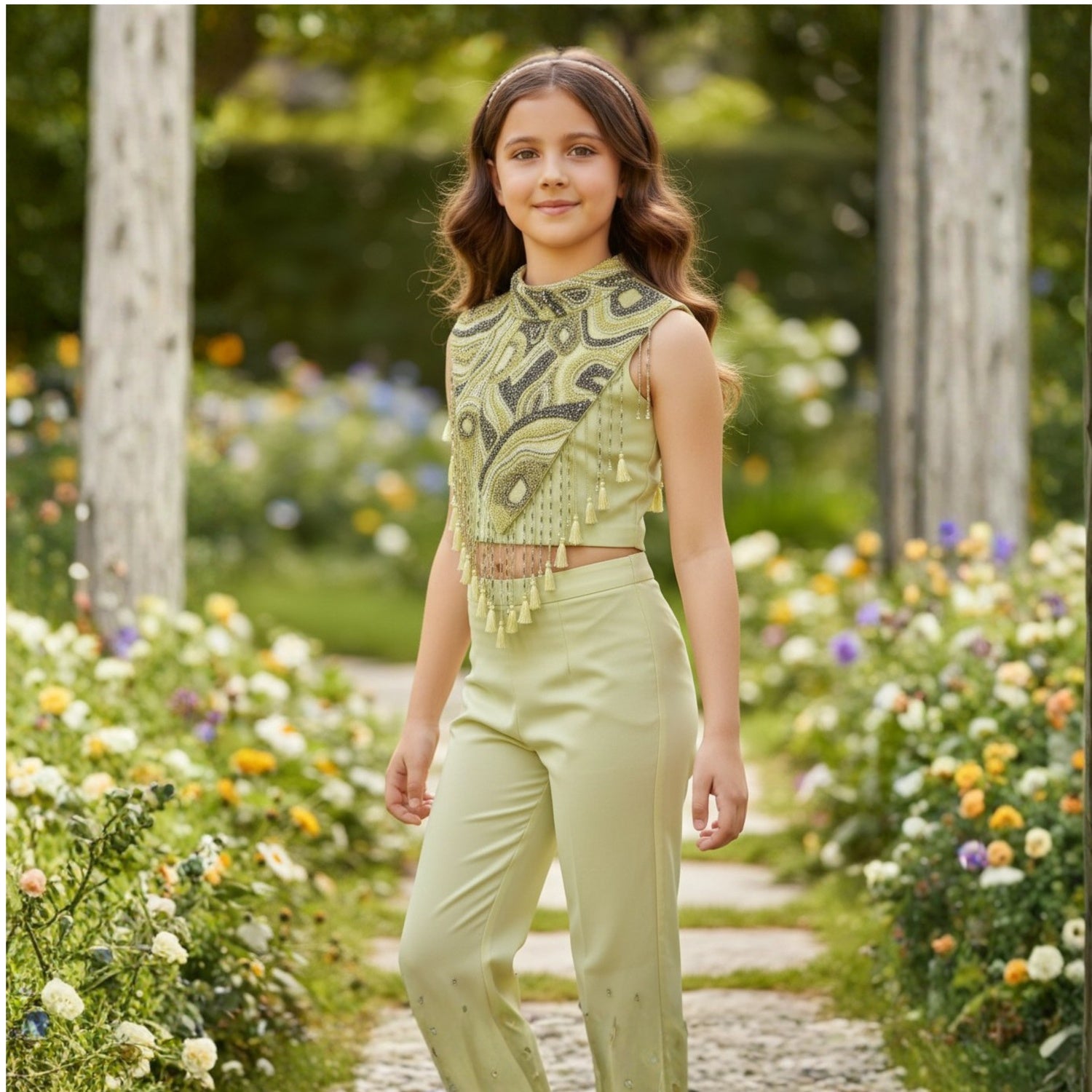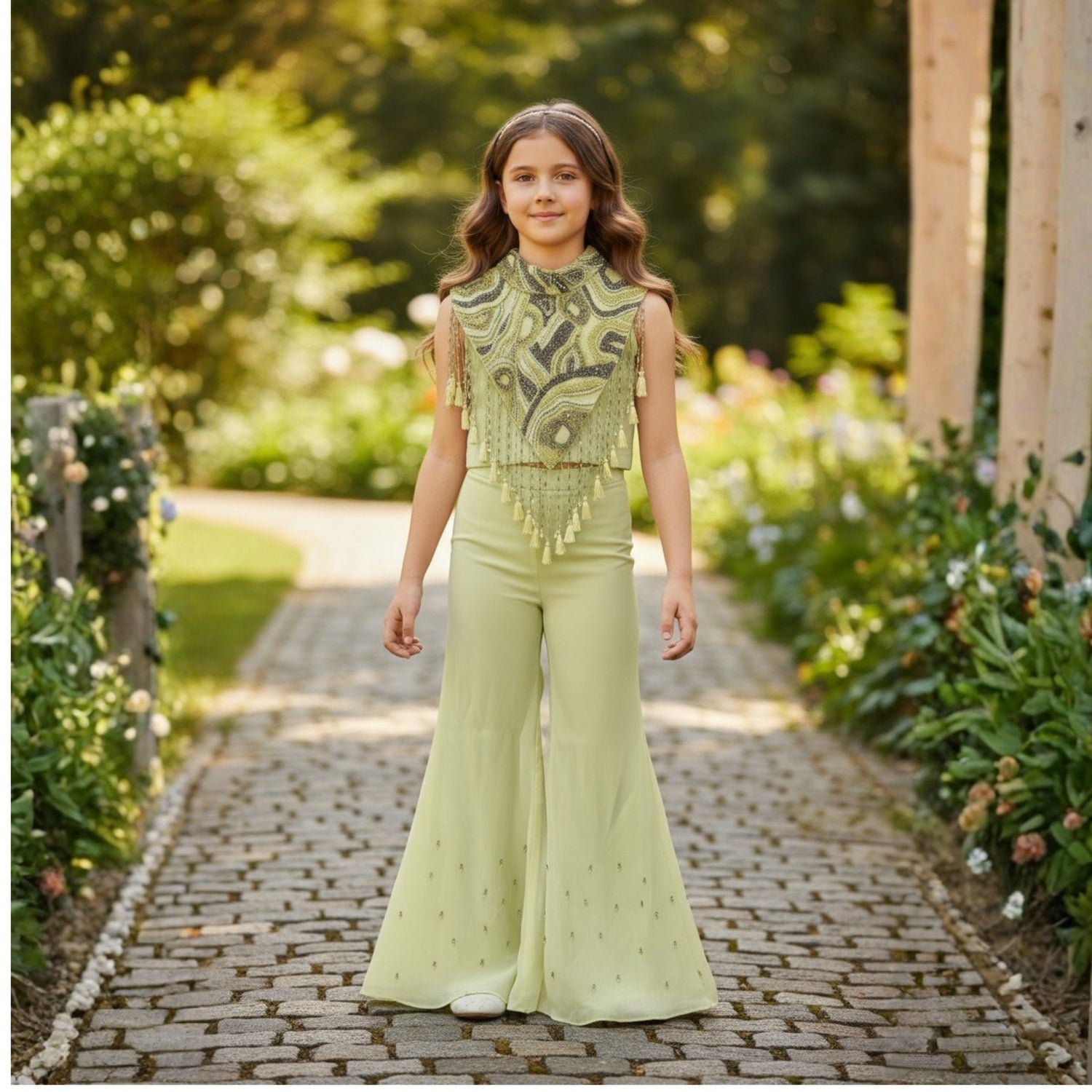 A vibrant lime yellow Sharara set featuring a heavily embellished crop top with intricate pearl and crystal paisley embroidery, ruffled shoulders, and playful tassel fringe hem, paired with a flowy Sharara ? a bold and festive statement look.